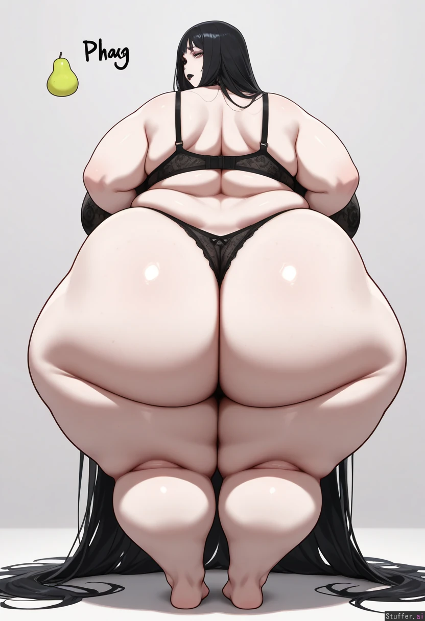 ((goth girl)), (pale skin, dark makeup, black lipstick, very pale skin), (detailed skin texture), 28, thick thighs, (hyper hips), plump face, wearing black lace bra and thong, long flowing dark hair, (massive thighs, huge hips, incredibly wide hips, hyper thighs), (Fat rolls, dimpled fat, flabby, soft fat, heavy sagging flab), (flabby, deep navel), ((soft flab, cellulite, dimples and wrinkles)), weight gain, feedee, ssbbw ((thicc, phat)), ((pawg)), (huge ass, ridiculously fat ass, huge flabby dimpled cellulite covered ass, sagging ass, extremely wide hips, hips wider than shoulders, incredibly thick thighs, hyper wide hips), ((pear shaped, bottom-heavy, fat lower body, very flabby legs and thighs, absurdly wide hips, gorgeous woman)), ((incredibly obese woman, very fat woman with impossibly wide hips, exaggerated Bottomheavy body)),