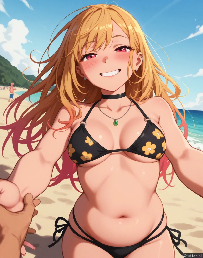 (Solo), Khyle.(Artist), Highres, is so (Marin_kitagawa), blushing, eye contact, (pudgy belly), soft belly, belly rolls, (svelte), medium_breasts, pov, comfort, giggling, at beach, conspicuous_bread(artist 1:2)