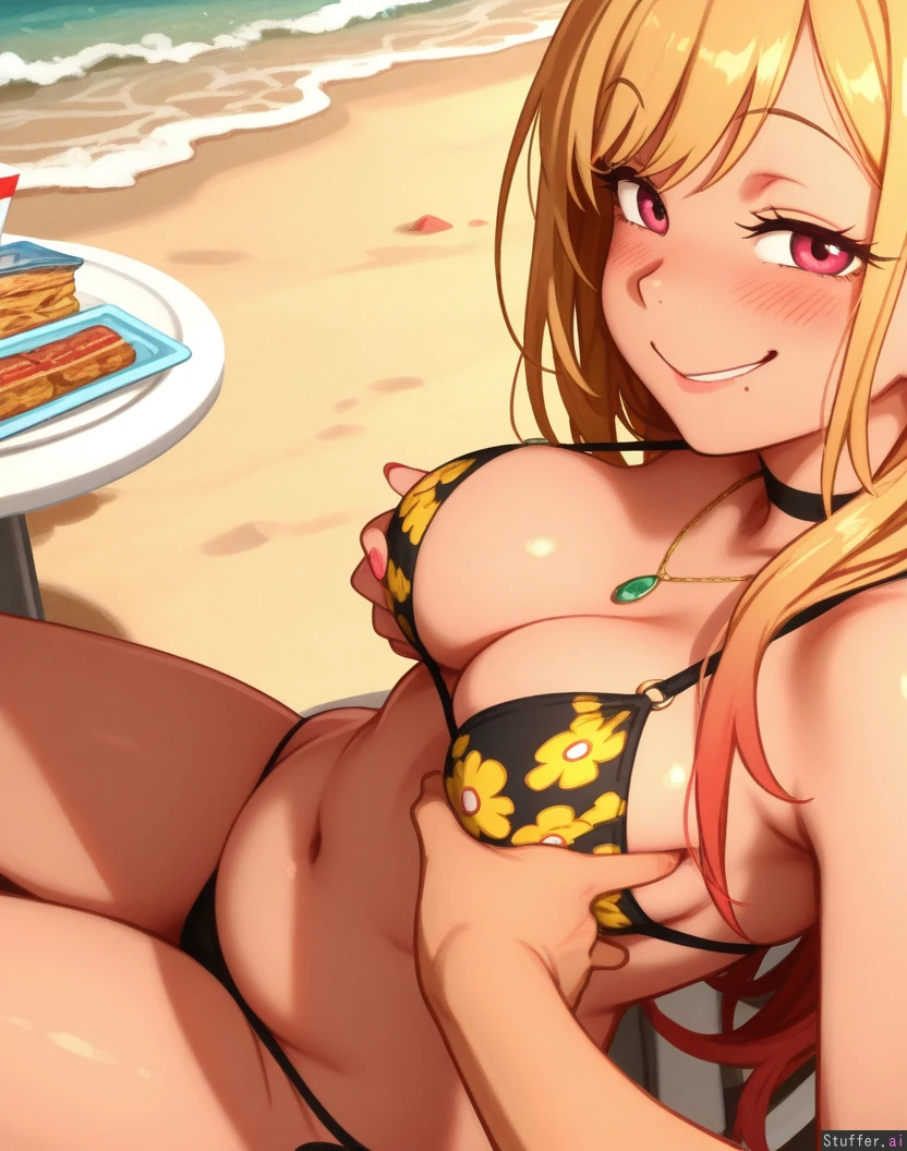 (Solo), Khyle.(Artist), Highres, is so (Marin_kitagawa), blushing, eye contact, (pudgy belly), soft belly, belly rolls, (svelte), medium_breasts, pov, comfort, giggling, at beach, sitting at table, eating, side view, groping breast belly, looking at viewer. Smirk