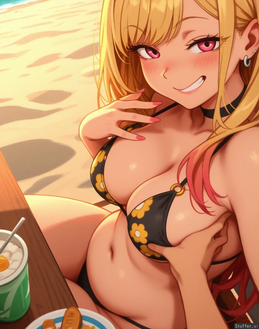 (Solo), Khyle.(Artist), Highres, is so (Marin_kitagawa), blushing, eye contact, (pudgy belly), soft belly, belly rolls, (svelte), medium_breasts, pov, comfort, giggling, at beach, sitting at table, eating, side view, groping breast belly, looking at viewer. Smirk