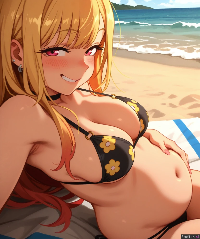 (Solo), Khyle.(Artist), Highres, is so (Marin_kitagawa), blushing, eye contact, (pudgy belly), soft belly, belly rolls, (svelte), medium_breasts, pov, comfort, giggling, at beach, side view, looking down, grabbing own belly, big blush cheeks,leaning back, mischievous eye contact with viewer, nervous smirk, groped by viewer, tight bikini top, soft belly fat. Boob grab