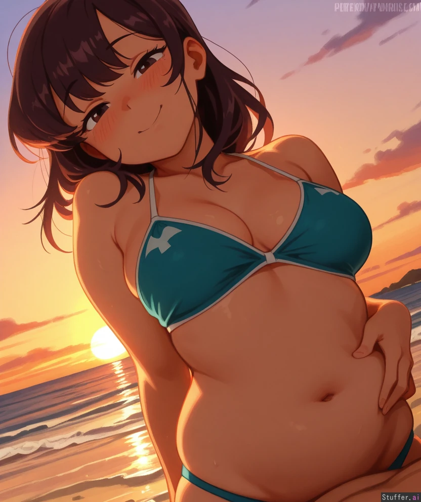(Solo), Khyle.(Artist), Highres, is so (Komi_shoko), blushing, eye contact, (pudgy belly), soft belly, belly rolls, (svelte), medium_breasts, pov, comfort, giggling, at beach, sunset, looking down, grabbing own belly, big blush cheeks, mischievous eye contact with viewer, nervous smirk, sex, tight bikini top,