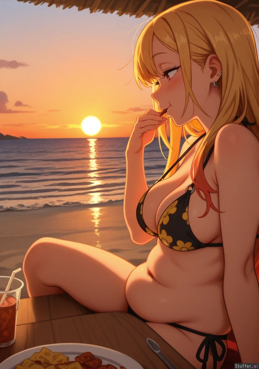 (Solo), Khyle.(Artist), Highres, is so (Marin_kitagawa), blushing, eye contact, (pudgy belly), soft belly, belly rolls, (svelte), medium_breasts, pov, comfort, giggling, at beach, sunset, sitting at table, eating, side view,