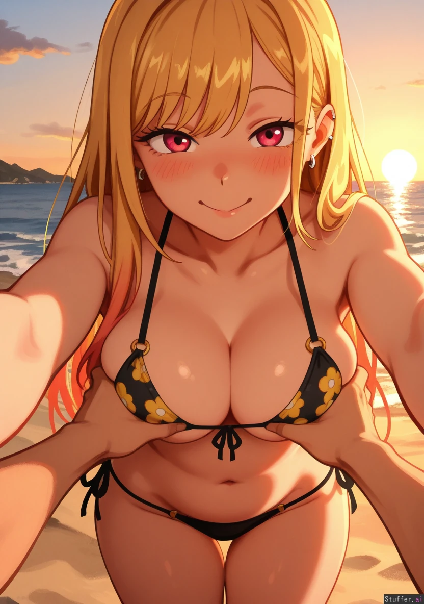 (Solo), Khyle.(Artist), Highres, is so (Marin_kitagawa), blushing, eye contact, (pudgy belly), soft belly, belly rolls, (svelte), medium_breasts, pov, comfort, at beach, sunset, seducing viewer, , soft thicc thighs, soft large boobs, voluptuous_female, multiple angles, Curvy. leaning_forward, boob squeeze together