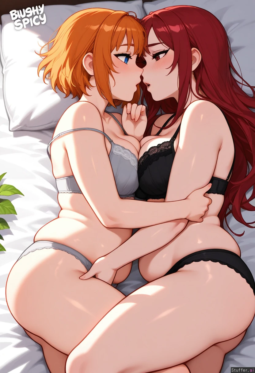 hdr, c.cu, blushyspicy, betterwithsalt:1.4, best quality, anime, beautiful, intricate details, pewbutt(artist), masterpiece, beautiful shading ## 2girls, lesbian_couple, yuri, small nose, blush, beautiful face, (attractive), laying, kissing body, side view ##1girl 1. Ginger 2. Blue eyes 3. Short_hair 4. Blush, shy, looking down, nervous, open mouth 5. (((Plump))), (((fat))), ((fat arms, fat legs)) ##2girl 1. Red eyes 2. Red hair 3. Long_hair 4. Seducing, grabbing ### Clothes 1. Bra 2. panties ### Location 1. Bedroom, bed, plants