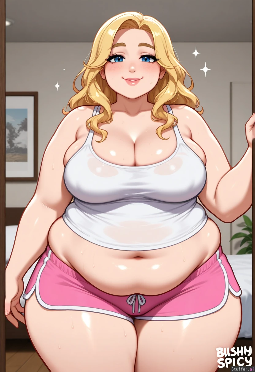 hdr, c.cu, blushyspicy, betterwithsalt:1.4, best quality, anime, beautiful, intricate details, pewbutt(artist), masterpiece, beautiful shading 1girl, mature, adult, milf, (attractive), (beautiful face), small nose, blond hair, blue eyes, wavy hair, long hair, bimbo, makeup, posing, sweat, holding fan, happy, sparkles, looking at viewer (((Fat))), ((obese)), flabby belly, ((fat arms, fat legs, fat face, fat cheeks, double chin, round face)) ((Vide hips)), (bottom heavy), (flabby hips), (fat thighs) White tank top, pink shorts Bedroom, plants, morning