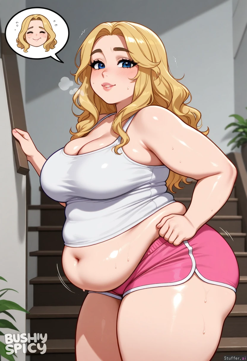 hdr, c.cu, blushyspicy, betterwithsalt:1.4, best quality, anime, beautiful, intricate details, pewbutt(artist), masterpiece, beautiful shading 1girl, mature, adult, milf, (attractive), (beautiful face), small nose, blond hair, blue eyes, wavy hair, long hair, bimbo, makeup, looking at viewer, ((struggling)), sweat, shaking, heavy breath, ((steaming body)), sagging belly, side view, relying (((Fat))), (((obese))), flabby belly, ((fat arms, fat legs, fat face, fat cheeks, double chin, round face)) (((Vide hips))), (bottom heavy), ((flabby hips)), ((fat thighs)) White tank top, pink shorts Home, stairs, plants, morning