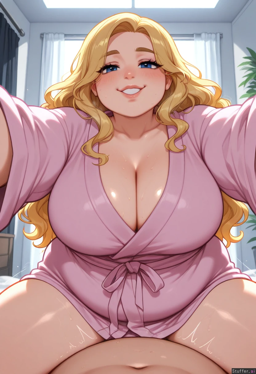 hdr, c.cu, blushyspicy, betterwithsalt:1.4, best quality, anime, beautiful, intricate details, pewbutt(artist), masterpiece, beautiful shading 1girl, mature, adult, milf, (attractive), (beautiful face), small nose, blond hair, blue eyes, wavy hair, long hair, bimbo, makeup, looking at viewer, ((struggling)), sweat, heavy breath, ((steaming body)), laying in bed, (penetration, pov, happy, joy, orgasm) (((Fat))), (((obese))), flabby belly, ((fat arms, fat legs, fat face, fat cheeks, double chin, round face)) (((Vide hips))), (bottom heavy), ((flabby hips)), ((fat thighs)) Pink bathrobe, (wet hair) Bedroom, plants, morning