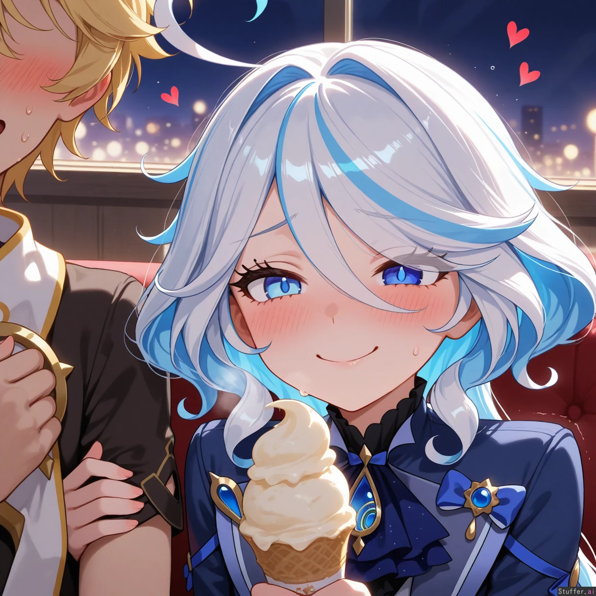 Detailed Background, (Masterpiece), Best_quality, intricate_detail, perfect image, (heart), effect, motion lines, one on one, pure,night,dark, couple, (at ice cream parlor), (1girl, (Furina), ((happy smile), breathing heavy, panting, blushing, tired, covered in ice cream)) (1boy, (Aether), ((nervous, anxious, worried))) love each other, spending time together,