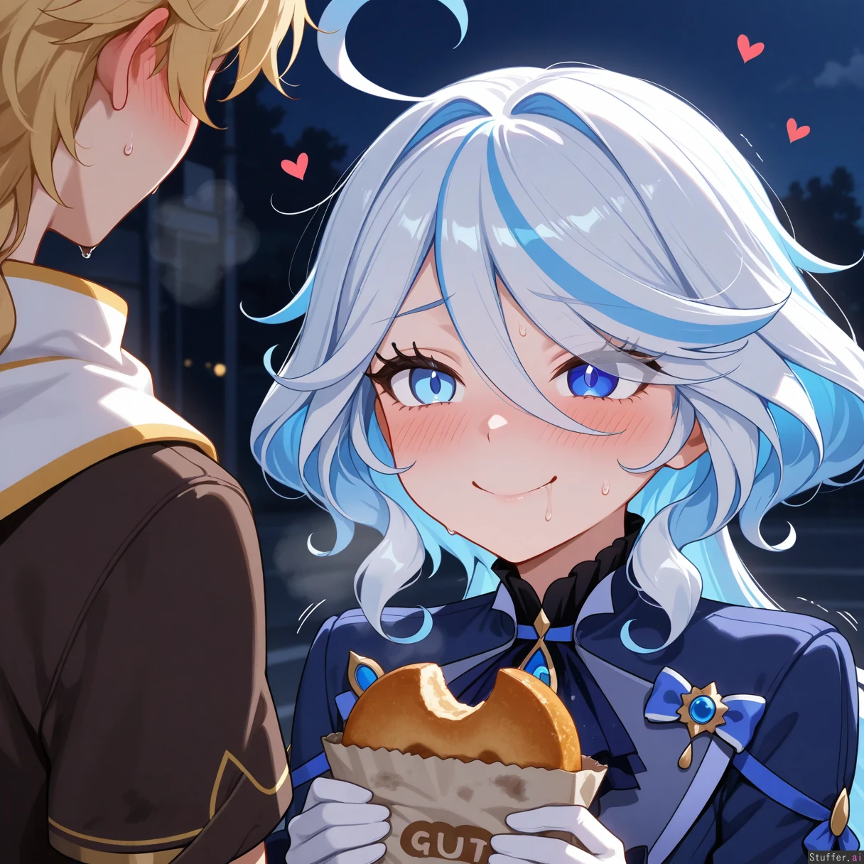 Detailed Background, (Masterpiece), Best_quality, intricate_detail, perfect image, (heart), effect, motion lines, one on one, pure,night,dark, couple, girl overate donuts and is breathing hard with effort, guy is amazed by how much she loves donuts , she keeps eating and eating, she keeps packing away donuts into her mouth, dirty clothes, (at donuts parlor), (1girl, (Furina), ((happy smile), breathing heavy, panting, blushing, tired, covered in donuts )) (1boy, (Aether), ((nervous, anxious, worried))) love each other, spending time together,