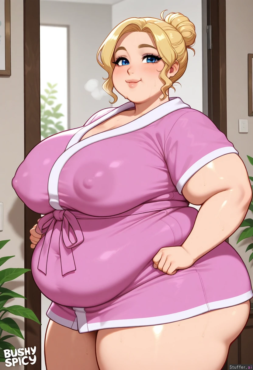hdr, c.cu, blushyspicy, betterwithsalt:1.4, best quality, anime, beautiful, intricate details, pewbutt(artist), masterpiece, beautiful shading 1girl, mature, adult, milf, (attractive), (beautiful face), small nose, blond hair, blue eyes, wavy hair, short hair, hair bun, bimbo, makeup, looking at viewer, sweat, heavy breath, ((steaming body)), erected nipples, (big nipples), (sweat), side view (((Hyper Fat))), (((obese))), flabby belly, (((fat arms, fat legs))), (((fat face, fat cheeks, double chin, round face))) ((((Vide hips)))), (bottom heavy), ((flabby hips)), ((fat thighs)) Pink bathrobe Bedroom, plants, morning