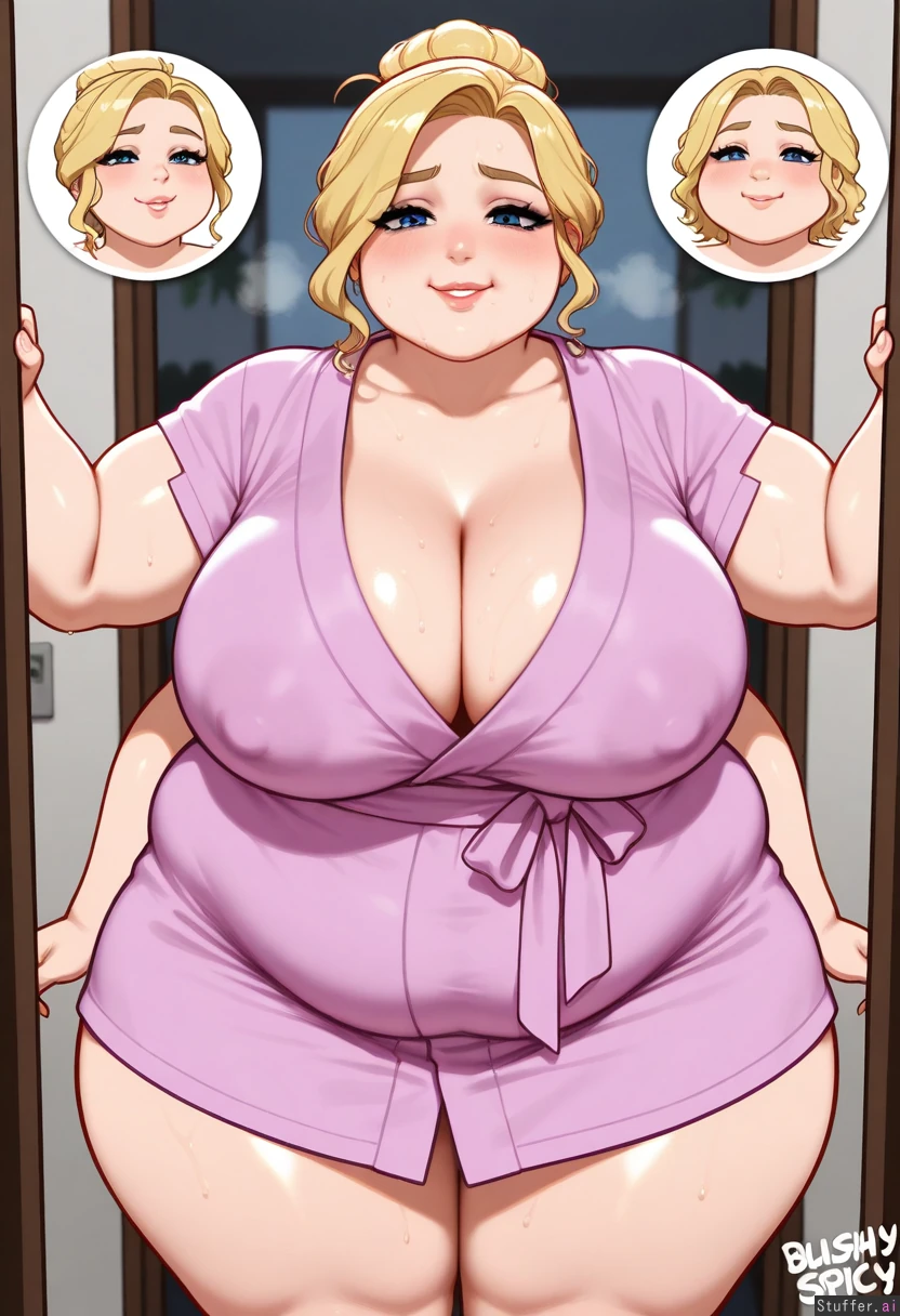 hdr, c.cu, blushyspicy, betterwithsalt:1.4, best quality, anime, beautiful, intricate details, pewbutt(artist), masterpiece, beautiful shading 1girl, mature, adult, milf, (attractive), (beautiful face), small nose, blond hair, blue eyes, wavy hair, short hair, hair bun, bimbo, makeup, looking at viewer, sweat, heavy breath, ((steaming body)), erected nipples, (big nipples), (sweat), (struggling, struggle, tired) (((Hyper Fat))), (((obese))), flabby belly, (((fat arms, fat legs))), (((fat face, fat cheeks, double chin, round face))) ((((Vide hips)))), (bottom heavy), ((flabby hips)), ((fat thighs)), (immobile) Pink bathrobe Bedroom, plants, morning
