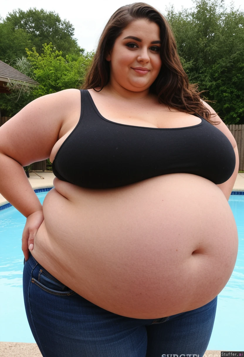 Brunette hair, wavy hair, brown eyes, oval shaped face, beautiful, subtle smile, thick dark eyebrows, long eyelashes, full body, perfect lighting, tanned skin, succulent body, wide hips, black crop top and tight jeans, poolside, (gigantic_belly:1.6), jiggly SSBBW beauty, (massive belly overhang:1.5), extremely stuffed belly, side view, belly focused, cleavage, coming out of the water, wet body, fatter
