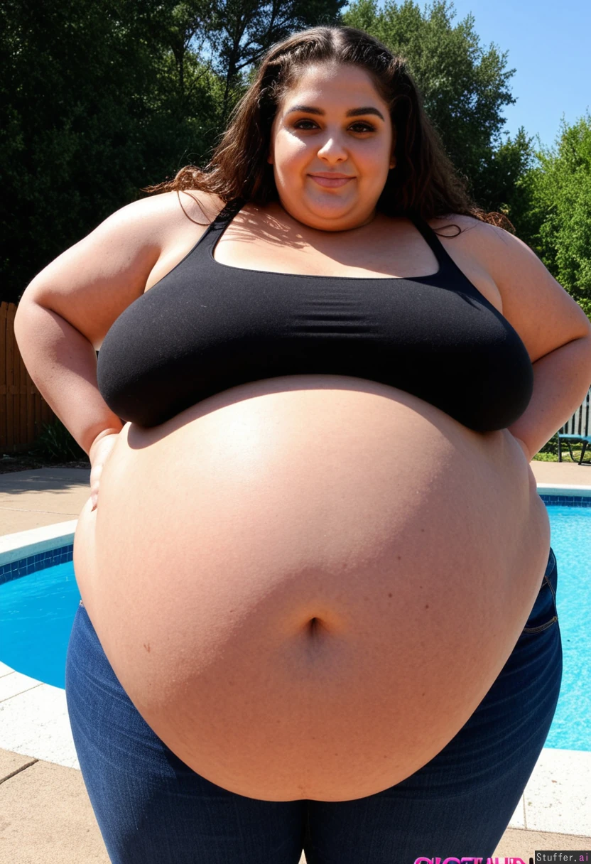 Brunette hair, wavy hair, brown eyes, oval shaped face, beautiful, subtle smile, thick dark eyebrows, long eyelashes, full body, perfect lighting, bronze skin, succulent body, wide hips, black crop top and tight jeans, poolside, (gigantic_belly:1.6), jiggly SSBBW beauty, (massive belly overhang:1.5), extremely stuffed belly, side view, belly focused, cleavage, coming out of the water, wet body, fatter