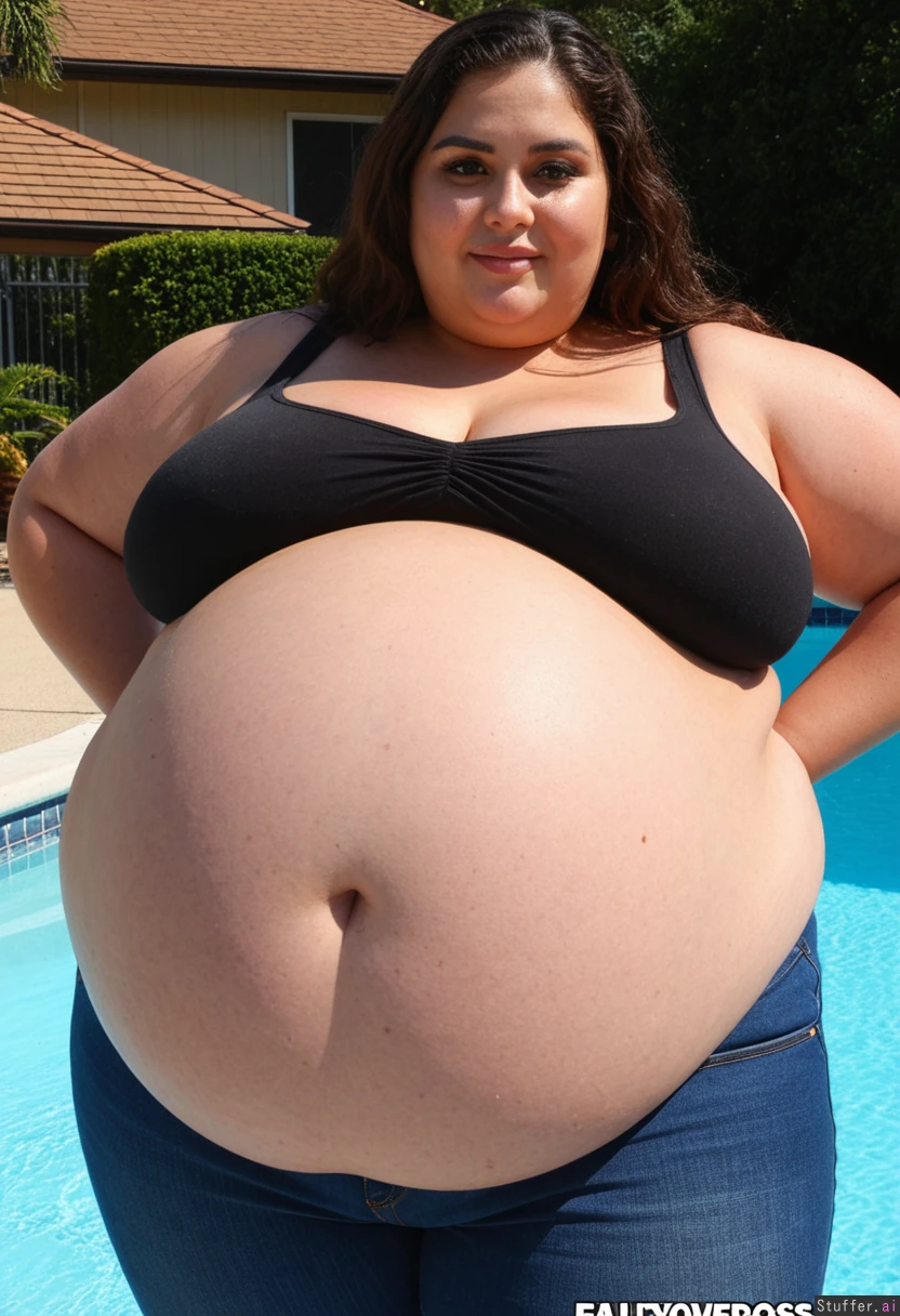 SSBBW Latina wife, Brunette hair, wavy hair, brown eyes, oval shaped face, beautiful, subtle smile, thick dark eyebrows, long eyelashes, full body, perfect lighting, bronze skin, succulent body, wide hips, black crop top and tight jeans, poolside, (gigantic_belly:1.6), jiggly SSBBW beauty, (massive belly overhang:1.5), extremely stuffed belly, side view, belly focused, cleavage, coming out of the water, wet body, fatter