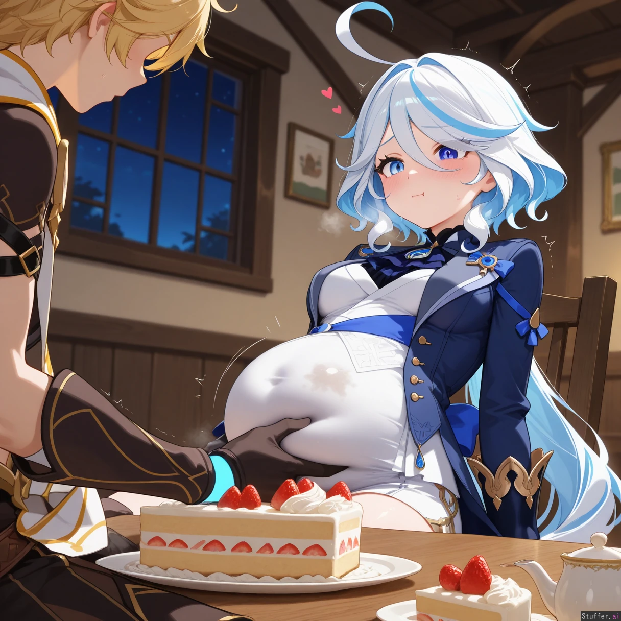 Detailed Background, (Masterpiece), Best_quality, intricate_detail, perfect image, (heart), effect, motion lines, one on one, pure,night,dark, ((genshin_impact clothes)) couple, sitting at cake shop, (girl is exhausted holding her covered belly, (stack of empty dirty white plates on the table), ((belly massage)) (at night cake shop), (1girl, (Furina), curvy, growing a bit chubby, soft covered tummy, covered belly growth, (covered medium breasts), blushing, exhausted, pouting, head leaning back, breathing heavy, panting, visible breath, she is having her belly rubbed and fondled) (1boy, (Aether), nervous, anxious, worried, fondling massaging her belly, salivated over girls bloated belly!) love each other, spending time together,