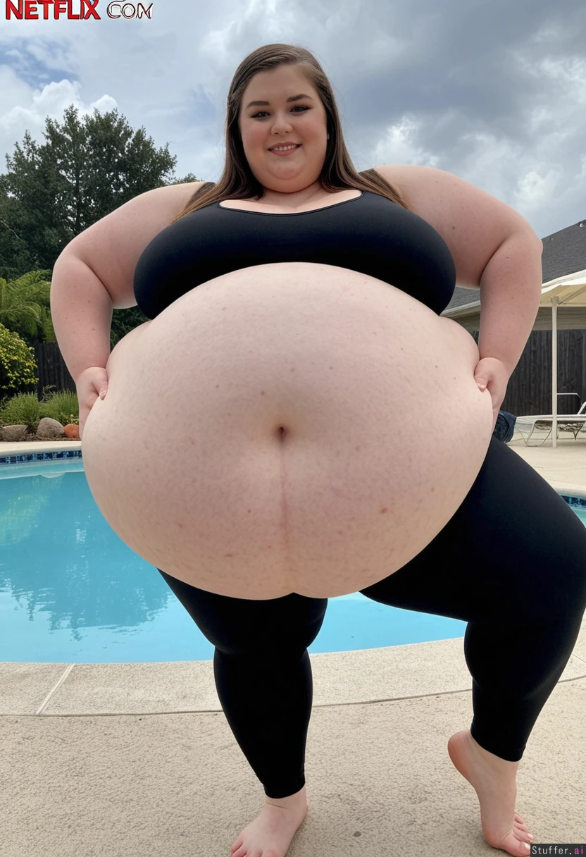 SSBBW Brunette woman at poolside, wearing a black bra, trying to fit into tight black leggings, barefoot, massive fat belly overhang that almost touches her knees, soft fat belly and rolls, holding up her fat belly, huge stuffed soft belly, long manicured fingernails, beautiful juicy belly, large belly beautifully hanging low, (Curvy body, plump hips, extra wide hips), netflix style, college vibes,theme is totally overstuffed with ultra fat food, ultra-detailed, young super foxy girl, 21-years-old, (Fully clothed:1.4), (wearing a covering huge fat bloated oversized adipose summerdress and black leggings:1.2), ssbbw, extremly obese, Afternoon overcast light, beautiful face. Huge spherical belly lies on . She smiles gracefully, glossy lips, makeup perfect, mascara, defined eyeliner, brunette hair catching light, big bust, big hips, fat arms, big blue eyes, long straight hair, huge fat rolls, (largest belly ever seen), college vibes, prom style, jewelry glinting. (emphasis on her enormous gigantic stuffed spherical belly beneath clothing), side view, standing