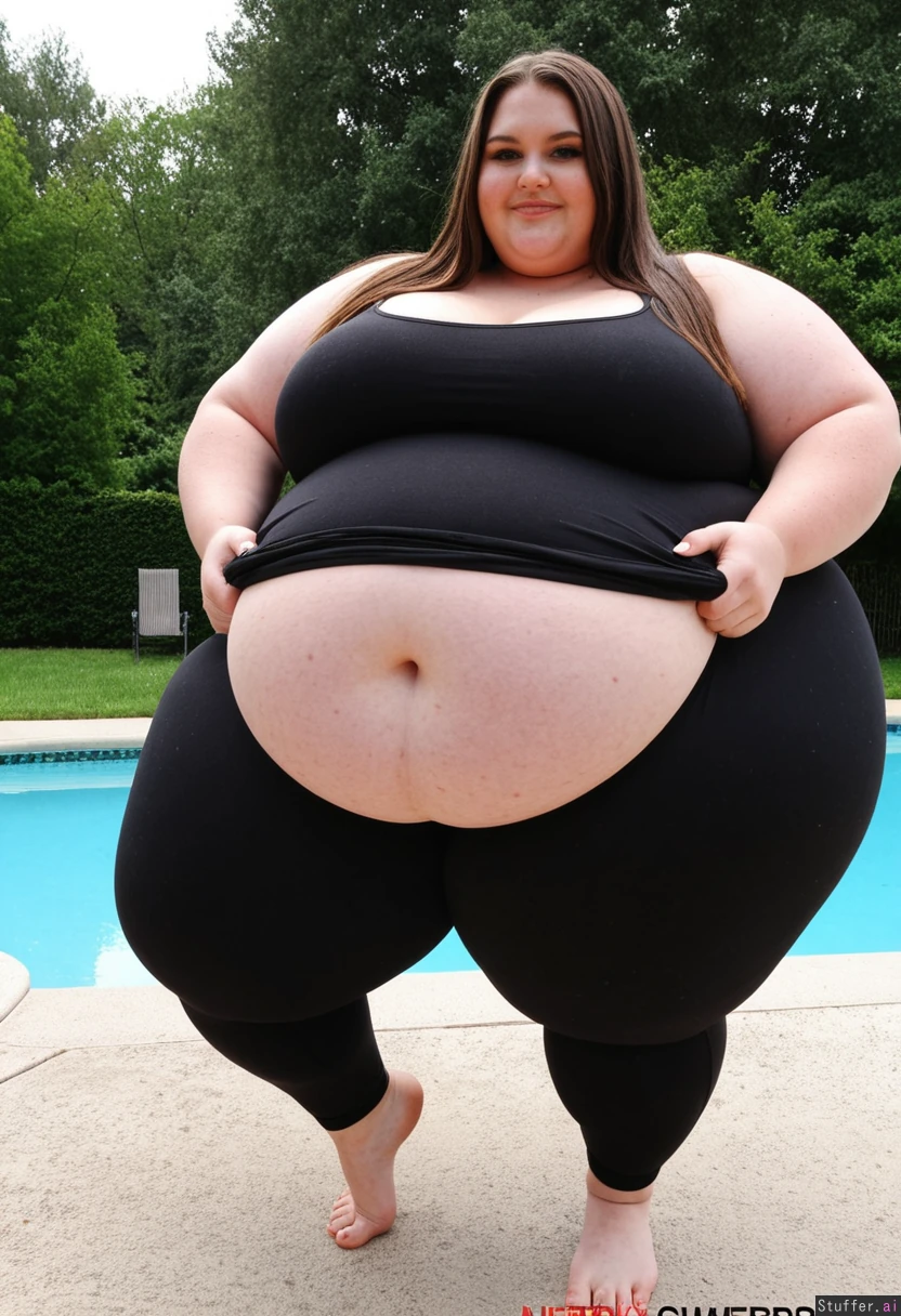 SSBBW Brunette woman at poolside, wearing a black bra, trying to fit into tight black leggings, barefoot, massive fat belly overhang that almost touches her knees, soft fat belly and rolls, holding up her fat belly, huge stuffed soft belly, long manicured fingernails, beautiful juicy belly, large belly beautifully hanging low, (Curvy body, plump hips, extra wide hips), netflix style, college vibes,theme is totally overstuffed with ultra fat food, ultra-detailed, young super foxy girl, 21-years-old, (Fully clothed:1.4), (wearing a covering huge fat bloated oversized adipose summerdress and black leggings:1.2), ssbbw, extremly obese, tanned skin, Afternoon overcast light, beautiful face. Huge spherical belly lies on . She smiles gracefully, glossy lips, makeup perfect, mascara, defined eyeliner, brunette hair catching light, big bust, big hips, fat arms, big blue eyes, long straight hair, huge fat rolls, (largest belly ever seen), college vibes, prom style, jewelry glinting. (emphasis on her enormous gigantic stuffed spherical belly beneath clothing), side view, standing