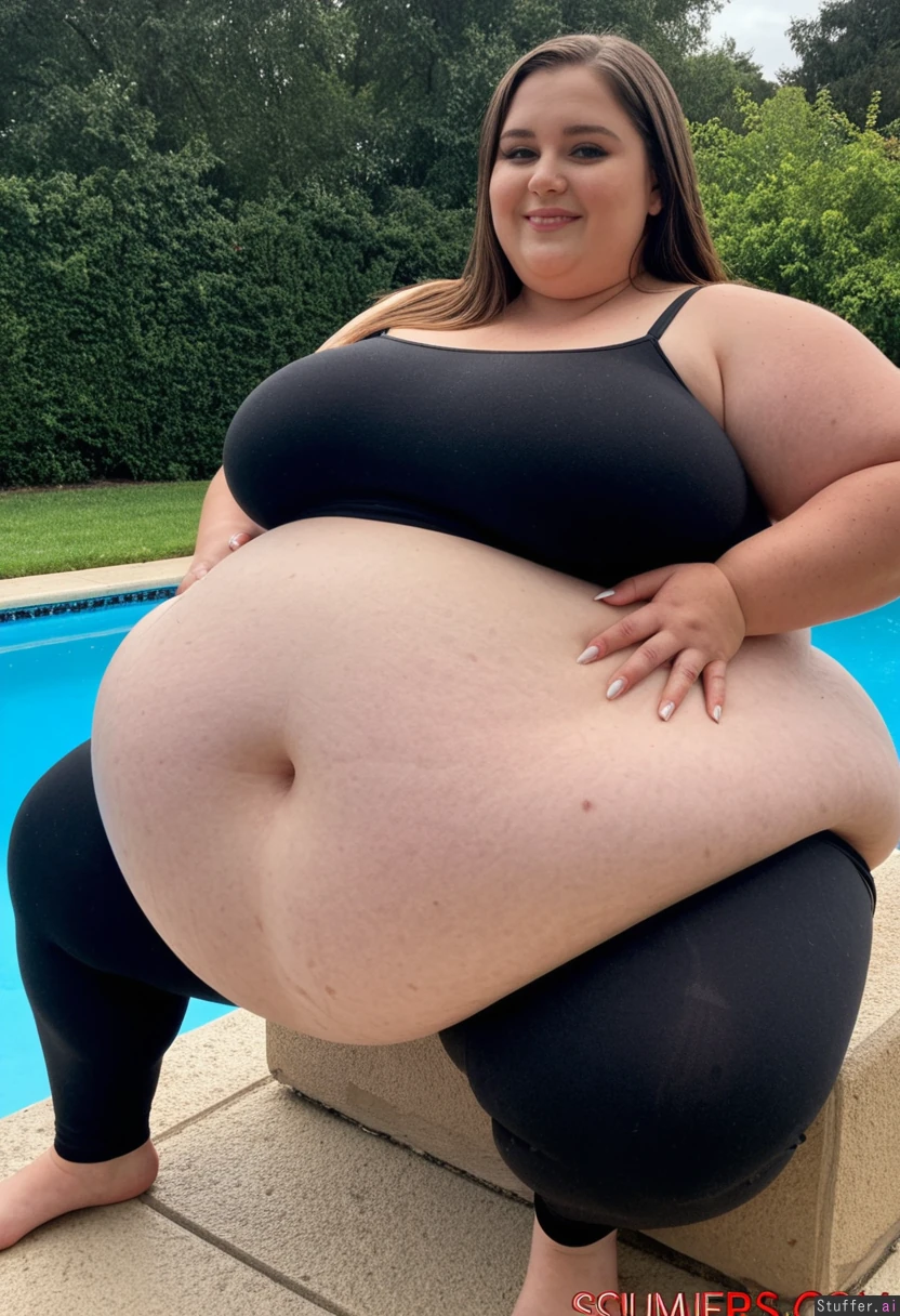 SSBBW Brunette woman at poolside, wearing a black bra, trying to fit into tight black leggings, barefoot, massive fat belly overhang that almost touches her knees, soft fat belly and rolls, holding up her fat belly, huge stuffed soft belly, long manicured fingernails, beautiful juicy belly, large belly beautifully hanging low, (Curvy body, plump hips, extra wide hips), netflix style, college vibes,theme is totally overstuffed with ultra fat food, ultra-detailed, young super foxy girl, 21-years-old, (Fully clothed:1.4), (wearing a covering huge fat bloated oversized adipose summerdress and black leggings:1.2), ssbbw, extremly obese, tanned skin, Afternoon overcast light, beautiful face. Huge spherical belly lies on . She smiles gracefully, glossy lips, makeup perfect, mascara, defined eyeliner, brunette hair catching light, big bust, big hips, fat arms, big blue eyes, long straight hair, huge fat rolls, (largest belly ever seen), college vibes, prom style, jewelry glinting. (emphasis on her enormous gigantic stuffed spherical belly beneath clothing), side view, standing