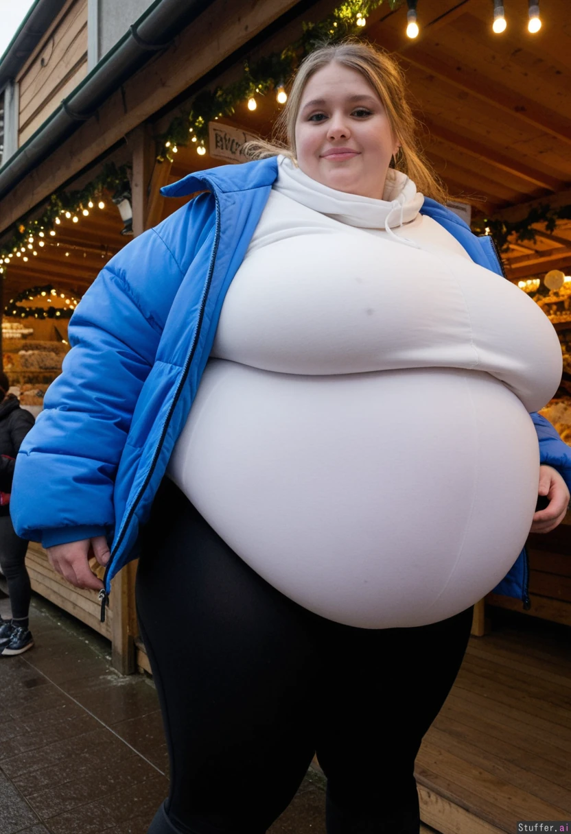 Cinematic film still, Netflix European drama aesthetic, close-up photo taken by friend, observational angle, female college student, 21-years-old, Caucasian, obese blob with a hyper_belly, (wearing ultra covering trendy outfit:1.3), (oversized covering long huge fat wobbly bloated white college sweatshirt layered under open oversized padded blue winter jacket:1.3), extra-long cut reaching mid-thigh, straight weighted hem, non-elastic fabric, shirt and jacket fully covering belly, cannot ride up, (covering fat bloated cushiony high-waisted opaque black thermal leggings:1.3), waistband positioned high above navel, waistband locked in place by extreme belly pressure, leggings stretched far forward by massive lower belly volume, clear double-belly geometry, (fully clothed:1.3), morbidly obese with an ultra huge saggy hanging belly, fully contained beneath clothing, very heavy lower belly projecting forward and downward, tight waistband compressing belly fat deeply, fabric pulled taut above, heavy winter folds below, standing next to wooden market tables stacked with sausages, waffles and mugs, side view, totally stuffed posture, slow grounded stance, beautiful narrow symmetrical face of a top model, ultra attractive face, Prom makeup, rosy cheeks, foxy smile with eyeliner, glossy lips, Dark blonde hair tucked into scarf with loose strands, small hoops, small bust,big eyes, realistic body volume physics, ultra realistic belly hang and winter fabric tension, background: German Christmas market, lights, steam, people staring with mixed awe and curiosity Overcast winter afternoon, cold diffused light, Netflix color science, cool blues, warm highlights, film grain, lens breathing, candid realism