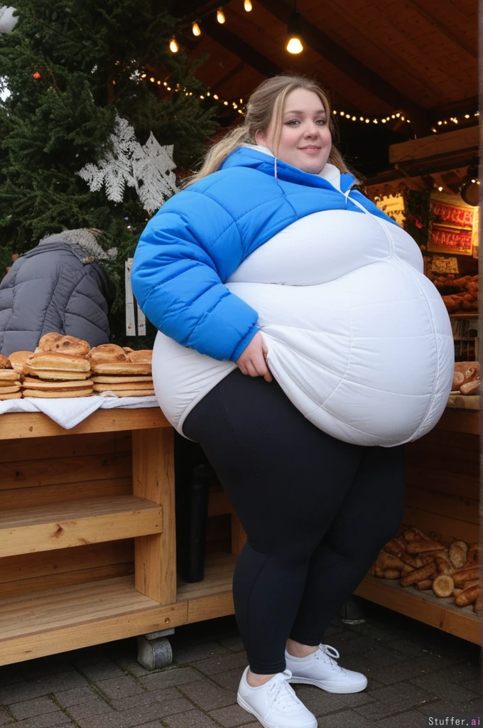 Cinematic film still, Netflix European drama aesthetic, close-up photo taken by friend, observational angle, female college student, 21-years-old, Caucasian, obese blob with a hyper_belly, (wearing ultra covering trendy outfit:1.3), (oversized covering long huge fat wobbly bloated white college sweatshirt layered under open oversized padded blue winter jacket:1.3), extra-long cut reaching mid-thigh, straight weighted hem, non-elastic fabric, shirt and jacket fully covering belly, cannot ride up, (covering fat bloated cushiony high-waisted opaque black thermal leggings:1.3), waistband positioned high above navel, waistband locked in place by extreme belly pressure, leggings stretched far forward by massive lower belly volume, clear double-belly geometry, (fully clothed:1.3), morbidly obese with an ultra huge saggy hanging belly, fully contained beneath clothing, very heavy lower belly projecting forward and downward, tight waistband compressing belly fat deeply, fabric pulled taut above, heavy winter folds below, standing next to wooden market tables stacked with sausages, waffles and mugs, side view, totally stuffed posture, slow grounded stance, beautiful narrow symmetrical face of a top model, ultra attractive face, Prom makeup, rosy cheeks, foxy smile with eyeliner, glossy lips, Dark blonde hair tucked into scarf with loose strands, small hoops, small bust,big eyes, realistic body volume physics, ultra realistic belly hang and winter fabric tension, background: German Christmas market, lights, steam, people staring with mixed awe and curiosity Overcast winter afternoon, cold diffused light, Netflix color science, cool blues, warm highlights, film grain, lens breathing, candid realism
