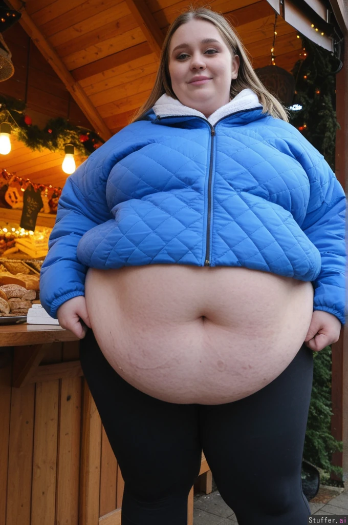 Cinematic film still, Netflix European drama aesthetic, close-up photo taken by friend, observational angle, female college student, 21-years-old, Caucasian, obese blob with a hyper_belly, (wearing ultra covering trendy outfit:1.3), (oversized covering long huge fat wobbly bloated white college sweatshirt layered under open oversized padded blue winter jacket:1.3), extra-long cut reaching mid-thigh, straight weighted hem, non-elastic fabric, shirt and jacket fully covering belly, cannot ride up, (covering fat bloated cushiony high-waisted opaque black thermal leggings:1.3), waistband positioned high above navel, waistband locked in place by extreme belly pressure, leggings stretched far forward by massive lower belly volume, clear double-belly geometry, (fully clothed:1.3), morbidly obese with an ultra huge saggy hanging belly, fully contained beneath clothing, very heavy lower belly projecting forward and downward, tight waistband compressing belly fat deeply, fabric pulled taut above, heavy winter folds below, standing next to wooden market tables stacked with sausages, waffles and mugs, side view, totally stuffed posture, slow grounded stance, beautiful narrow symmetrical face of a top model, ultra attractive face, Prom makeup, rosy cheeks, foxy smile with eyeliner, glossy lips, Dark blonde hair tucked into scarf with loose strands, small hoops, small bust,big eyes, realistic body volume physics, ultra realistic belly hang and winter fabric tension, background: German Christmas market, lights, steam, people staring with mixed awe and curiosity Overcast winter afternoon, cold diffused light, Netflix color science, cool blues, warm highlights, film grain, lens breathing, candid realism