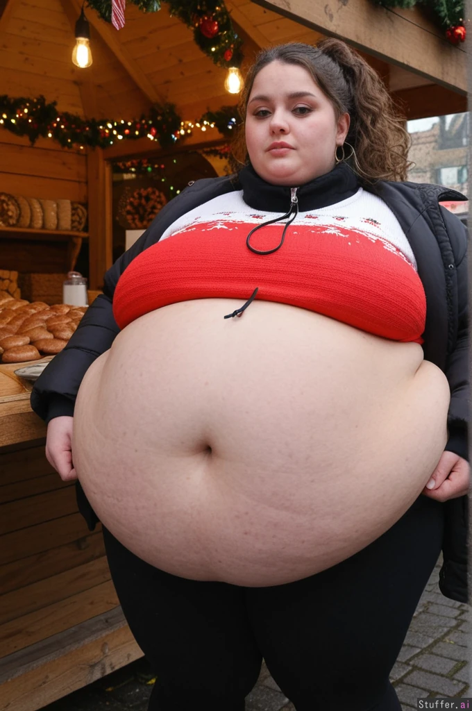 Cinematic film still, Netflix aesthetic, close-up photo taken by friend, observational angle, female college student, 21-years-old, Caucasian, obese blob with a hyper_belly, (wearing ultra covering trendy outfit:1.3), (oversized covering long huge fat wobbly bloated Christmas Pullover layered under open oversized long padded winter jacket:1.3), extra-long cut reaching mid-thigh, straight weighted hem, non-elastic fabric, shirt and jacket fully covering belly, cannot ride up, (covering fat bloated cushiony high-waisted opaque black thermal leggings:1.3), waistband positioned high above navel, waistband locked in place by extreme belly pressure, leggings stretched far forward by massive lower belly volume, clear double-belly geometry, (fully clothed:1.3), morbidly obese with an ultra huge saggy hanging belly, fully contained beneath clothing, very heavy lower belly projecting forward and downward, tight waistband compressing belly fat deeply, fabric pulled taut above, heavy winter folds below, standing next to wooden market tables stacked with sausages, waffles and mugs, side view, totally stuffed posture, slow grounded stance, beautiful narrow symmetrical face of a top model, ultra attractive face, soft winter makeup, rosy cheeks, eyeliner, glossy lips, big hoops earrings, brunette messy curly ponytail tucked into scarf with loose strands, small hoops, small bust,big eyes, realistic body volume physics, ultra realistic belly hang and winter fabric tension, background: German Christmas market, lights, steam, people staring with mixed awe and curiosity Overcast winter afternoon, cold diffused light, Netflix color science, cool blues, warm highlights, film grain, lens breathing, candid realism