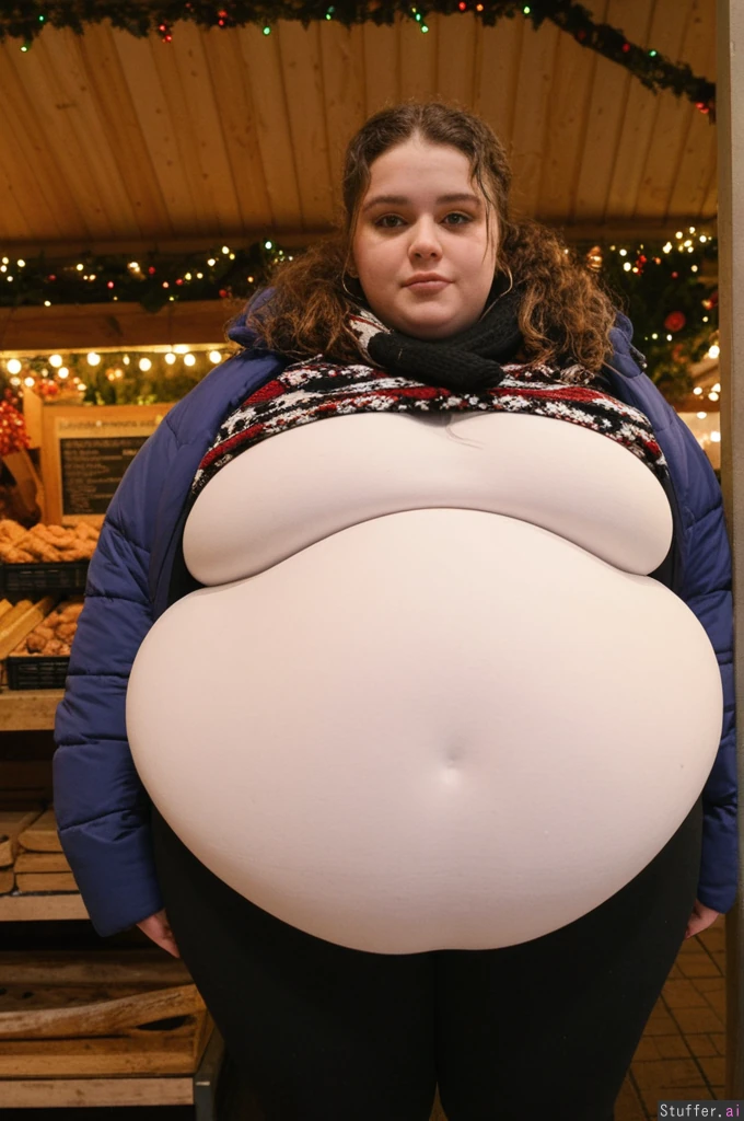 Cinematic film still, Netflix aesthetic, close-up photo taken by friend, observational angle, female college student, 21-years-old, Caucasian, obese blob with a hyper_belly, (wearing ultra covering trendy outfit:1.3), (oversized covering long huge fat wobbly bloated Christmas sweater layered under open oversized long padded winter jacket:1.3), extra-long cut reaching mid-thigh, straight weighted hem, non-elastic fabric, shirt and jacket fully covering belly, cannot ride up, (covering fat bloated cushiony high-waisted opaque black thermal leggings:1.3), waistband positioned high above navel, waistband locked in place by extreme belly pressure, leggings stretched far forward by massive lower belly volume, clear double-belly geometry, (fully clothed:1.3), morbidly obese with an ultra huge saggy hanging belly, fully contained beneath clothing, very heavy lower belly projecting forward and downward, tight waistband compressing belly fat deeply, fabric pulled taut above, heavy winter folds below, standing next to wooden market tables stacked with sausages, waffles and mugs, side view, totally stuffed posture, slow grounded stance, beautiful narrow symmetrical face of a top model, ultra attractive face, soft winter makeup, rosy cheeks, eyeliner, glossy lips, big hoops earrings, brunette messy curly ponytail tucked into scarf with loose strands, small hoops, small bust,big eyes, realistic body volume physics, ultra realistic belly hang and winter fabric tension, background: German Christmas market, lights, steam, people staring with mixed awe and curiosity Overcast winter afternoon, cold diffused light, Netflix color science, cool blues, warm highlights, film grain, lens breathing, candid realism