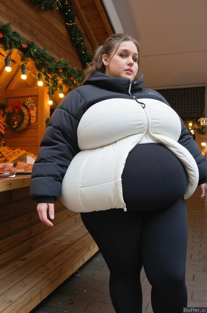 Cinematic film still, Netflix aesthetic, close-up photo taken by friend, observational angle, female college student, 21-years-old, Caucasian, obese blob with a hyper_belly, (wearing ultra covering trendy outfit:1.3), (oversized covering long huge fat wobbly bloated Christmas sweater layered under open oversized long padded winter jacket:1.3), extra-long cut reaching mid-thigh, straight weighted hem, non-elastic fabric, shirt and jacket fully covering belly, cannot ride up, (covering fat bloated cushiony high-waisted opaque black thermal leggings:1.3), waistband positioned high above navel, waistband locked in place by extreme belly pressure, leggings stretched far forward by massive lower belly volume, clear double-belly geometry, (fully clothed:1.3), morbidly obese with an ultra huge saggy hanging belly, fully contained beneath clothing, very heavy lower belly projecting forward and downward, tight waistband compressing belly fat deeply, fabric pulled taut above, heavy winter folds below, standing next to wooden market tables stacked with sausages, waffles and mugs, side view, totally stuffed posture, slow grounded stance, beautiful narrow symmetrical face of a top model, ultra attractive face, soft winter makeup, rosy cheeks, eyeliner, glossy lips, big hoops earrings, brunette messy ponytail tucked into scarf with loose strands, small hoops, small bust,big eyes, realistic body volume physics, ultra realistic belly hang and winter fabric tension, background: German Christmas market, lights, steam, people staring with mixed awe and curiosity Overcast winter afternoon, cold diffused light, Netflix color science, cool blues, warm highlights, film grain, lens breathing, candid realism
