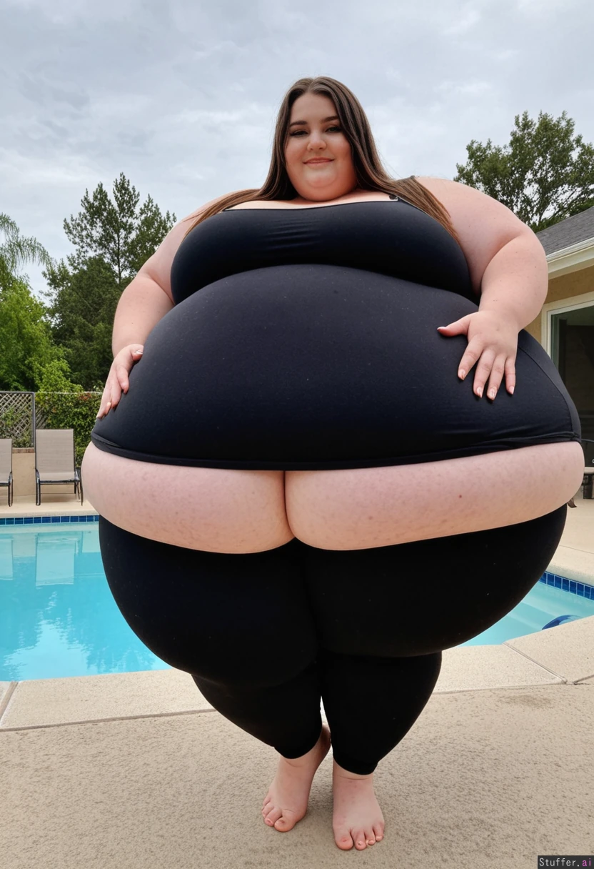 SSBBW Brunette woman at poolside, wearing a black bra, trying to fit into tight black leggings, barefoot, massive fat belly overhang that almost touches her knees, soft fat belly and rolls, holding up her fat belly, huge stuffed soft belly, long manicured fingernails, beautiful juicy belly, large belly beautifully hanging low, (Curvy body, plump hips, extra wide hips), netflix style, college vibes,theme is totally overstuffed with ultra fat food, ultra-detailed, young super foxy girl, 21-years-old, (Fully clothed:1.4), (wearing a covering huge fat bloated oversized adipose summerdress and black leggings:1.2), ssbbw, extremly obese, tanned skin, Afternoon overcast light, beautiful face. Huge spherical belly lies on . She smiles gracefully, glossy lips, makeup perfect, mascara, defined eyeliner, brunette hair catching light, big bust, big hips, fat arms, big blue eyes, long straight hair, huge fat rolls, (largest belly ever seen), college vibes, prom style, jewelry glinting. (emphasis on her enormous gigantic stuffed spherical belly beneath clothing), side view, standing