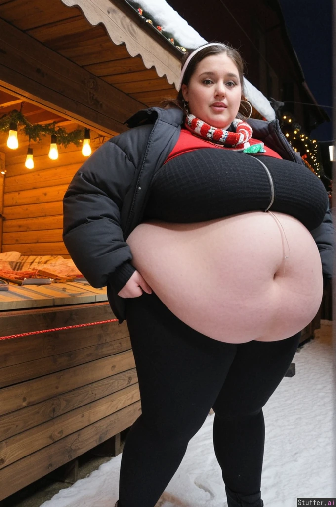 Cinematic film still, Netflix aesthetic, close-up photo taken by friend, observational angle, female college student, 21-years-old, Caucasian, obese blob with a hyper_belly, (wearing ultra covering trendy outfit:1.3), (oversized covering long huge fat wobbly bloated Christmas sweater layered under open oversized long padded winter jacket:1.3), extra-long cut reaching mid-thigh, straight weighted hem, non-elastic fabric, shirt and jacket fully covering belly, cannot ride up, (covering fat bloated cushiony high-waisted opaque black thermal leggings:1.3), waistband positioned high above navel, waistband locked in place by extreme belly pressure, leggings stretched far forward by massive lower belly volume, clear double-belly geometry, (fully clothed:1.3), morbidly obese with an ultra huge saggy hanging belly, fully contained beneath clothing, very heavy lower belly projecting forward and downward, tight waistband compressing belly fat deeply, fabric pulled taut above, heavy winter folds below, standing next to wooden market tables stacked with sausages, waffles and mugs, side view, totally stuffed posture, slow grounded stance, beautiful narrow symmetrical face of a top model, ultra attractive face, soft winter makeup, rosy cheeks, eyeliner, glossy lips, big hoops earrings, brunette messy ponytail tucked into scarf with loose strands, small hoops, small bust,big eyes, realistic body volume physics, ultra realistic belly hang and winter fabric tension, background: German Christmas market, lights, steam, people staring with mixed awe and curiosity Overcast winter afternoon, cold diffused light, Netflix color science, cool blues, warm highlights, film grain, lens breathing, candid realism