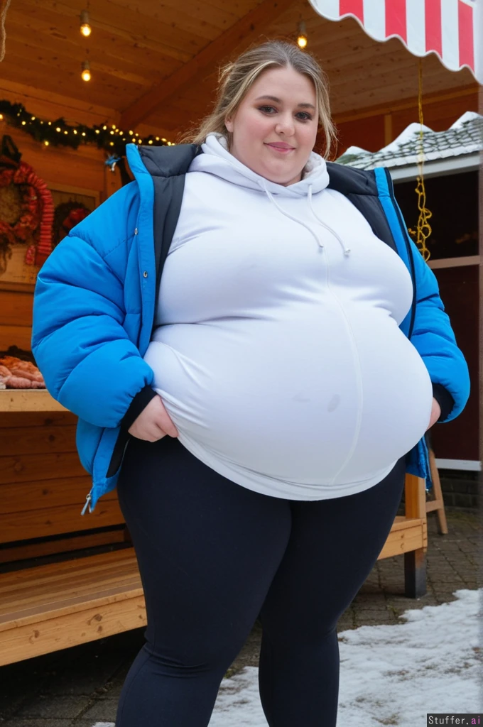 Cinematic film still, Netflix European drama aesthetic, close-up photo taken by friend, observational angle, female college student, 21-years-old, Caucasian, obese blob with a hyper_belly, (wearing ultra covering trendy outfit:1.3), (oversized covering long huge fat wobbly bloated white long college sweatshirt layered under open oversized padded blue winter jacket:1.3), extra-long cut reaching mid-thigh, straight weighted hem, non-elastic fabric, shirt and jacket fully covering belly, cannot ride up, (covering fat bloated cushiony high-waisted opaque black thermal leggings:1.3), waistband positioned high above navel, waistband locked in place by extreme belly pressure, leggings stretched far forward by massive lower belly volume, clear double-belly geometry, (fully clothed:1.3), morbidly obese with an ultra huge saggy hanging belly, fully contained beneath clothing, very heavy lower belly projecting forward and downward, tight waistband compressing belly fat deeply, fabric pulled taut above, heavy winter folds below, standing next to wooden market tables stacked with sausages, waffles and mugs, side view, totally stuffed posture, slow grounded stance, beautiful narrow symmetrical face of a top model, ultra attractive face, Prom makeup, rosy cheeks, foxy smile with eyeliner, glossy lips, Dark blonde hair tucked into scarf with loose strands, small hoops, small bust,big eyes, realistic body volume physics, ultra realistic belly hang and winter fabric tension, background: German Christmas market, lights, steam, people staring with mixed awe and curiosity Overcast winter afternoon, cold diffused light, Netflix color science, cool blues, warm highlights, film grain, lens breathing, candid realism
