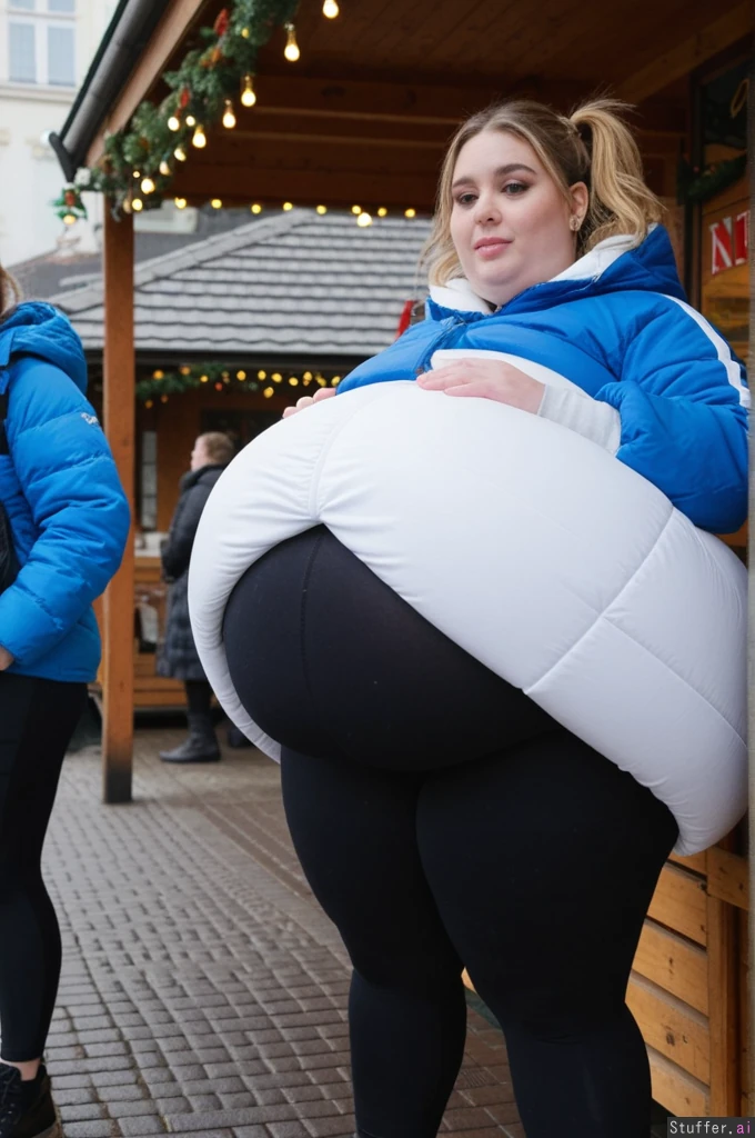 Cinematic film still, Netflix European drama aesthetic, close-up photo taken by friend, observational angle, female college student, 21-years-old, Caucasian, obese blob with a hyper_belly, (wearing ultra covering trendy outfit:1.3), beautiful narrow symmetrical face of a top model, ultra attractive face, (oversized covering long huge fat wobbly bloated white long college sweatshirt layered under open oversized padded blue winter jacket:1.3), extra-long cut reaching mid-thigh, straight weighted hem, non-elastic fabric, shirt and jacket fully covering belly, cannot ride up, (covering fat bloated cushiony high-waisted opaque black thermal leggings:1.3), waistband positioned high above navel, waistband locked in place by extreme belly pressure, leggings stretched far forward by massive lower belly volume, clear double-belly geometry, (fully clothed:1.3), morbidly obese with an ultra huge saggy hanging belly, fully contained beneath clothing, very heavy lower belly projecting forward and downward, tight waistband compressing belly fat deeply, fabric pulled taut above, heavy winter folds below, standing next to wooden market tables stacked with sausages, waffles and mugs, side view, totally stuffed posture, slow grounded stance, Prom makeup, rosy cheeks, foxy smile with eyeliner, glossy lips, Dark blonde hair tucked into scarf with loose strands, small hoops, small bust,big eyes, realistic body volume physics, ultra realistic belly hang and winter fabric tension, background: German Christmas market, lights, steam, people staring with mixed awe and curiosity Overcast winter afternoon, cold diffused light, Netflix color science, cool blues, warm highlights, film grain, lens breathing, candid realism