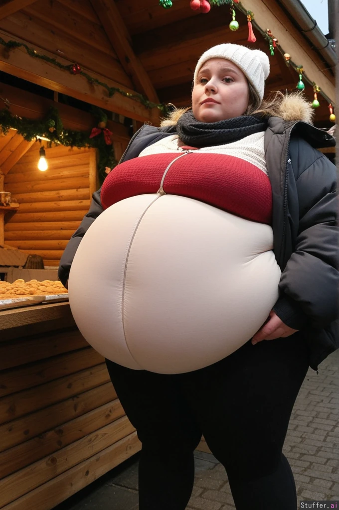 Cinematic film still, Netflix aesthetic, close-up photo taken by friend, observational angle, female college student, 21-years-old, Caucasian, obese blob with a hyper_belly, (wearing ultra covering trendy outfit:1.3), (oversized covering long huge fat wobbly bloated long Christmas sweater layered under open oversized long padded winter jacket:1.3), extra-long cut reaching mid-thigh, straight weighted hem, non-elastic fabric, shirt and jacket fully covering belly, cannot ride up, (covering fat bloated cushiony high-waisted opaque black thermal leggings:1.3), waistband positioned high above navel, waistband locked in place by extreme belly pressure, leggings stretched far forward by massive lower belly volume, clear double-belly geometry, (fully clothed:1.3), morbidly obese with an ultra huge saggy hanging belly, fully contained beneath clothing, very heavy lower belly projecting forward and downward, tight waistband compressing belly fat deeply, fabric pulled taut above, heavy winter folds below, standing next to wooden market tables stacked with sausages, waffles and mugs, side view, totally stuffed posture, slow grounded stance, beautiful narrow symmetrical face of a top model, ultra attractive face, soft winter makeup, rosy cheeks, eyeliner, glossy lips, big hoops earrings, brunette messy ponytail tucked into scarf with loose strands, small hoops, small bust,big eyes, realistic body volume physics, ultra realistic belly hang and winter fabric tension, background: German Christmas market, lights, steam, people staring with mixed awe and curiosity Overcast winter afternoon, cold diffused light, Netflix color science, cool blues, warm highlights, film grain, lens breathing, candid realism