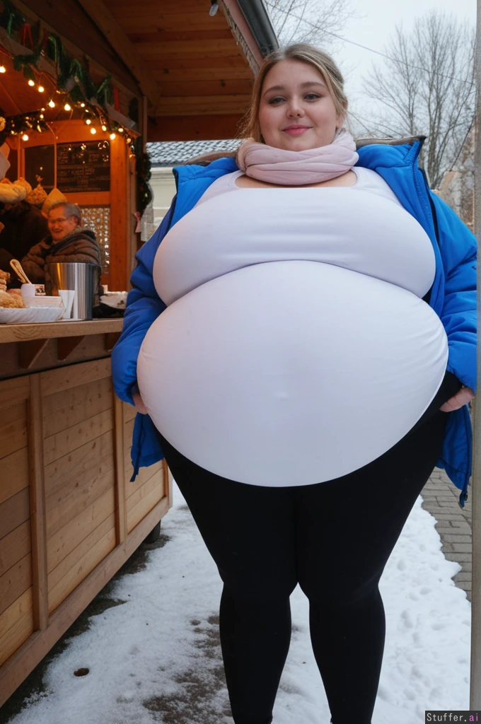 Cinematic film still, Netflix European drama aesthetic, close-up photo taken by friend, observational angle, female college student, 21-years-old, Caucasian, obese blob with a hyper_belly, (wearing ultra covering trendy outfit:1.3), beautiful narrow symmetrical face of a top model, ultra attractive face, (oversized covering long huge fat wobbly bloated white long college sweatshirt layered under open oversized padded blue winter jacket:1.3), extra-long cut reaching mid-thigh, straight weighted hem, non-elastic fabric, shirt and jacket fully covering belly, cannot ride up, (covering fat bloated cushiony high-waisted opaque black thermal leggings:1.3), waistband positioned high above navel, waistband locked in place by extreme belly pressure, leggings stretched far forward by massive lower belly volume, clear double-belly geometry, (fully clothed:1.3), morbidly obese with an ultra huge saggy hanging belly, fully contained beneath clothing, very heavy lower belly projecting forward and downward, tight waistband compressing belly fat deeply, fabric pulled taut above, heavy winter folds below, standing next to wooden market tables stacked with sausages, waffles and mugs, side view, totally stuffed posture, slow grounded stance, Prom makeup, rosy cheeks, foxy smile with eyeliner, glossy lips, Dark blonde hair tucked into scarf with loose strands, small hoops, small bust,big eyes, realistic body volume physics, ultra realistic belly hang and winter fabric tension, background: German Christmas market, lights, steam, people staring with mixed awe and curiosity Overcast winter afternoon, cold diffused light, Netflix color science, cool blues, warm highlights, film grain, lens breathing, candid realism
