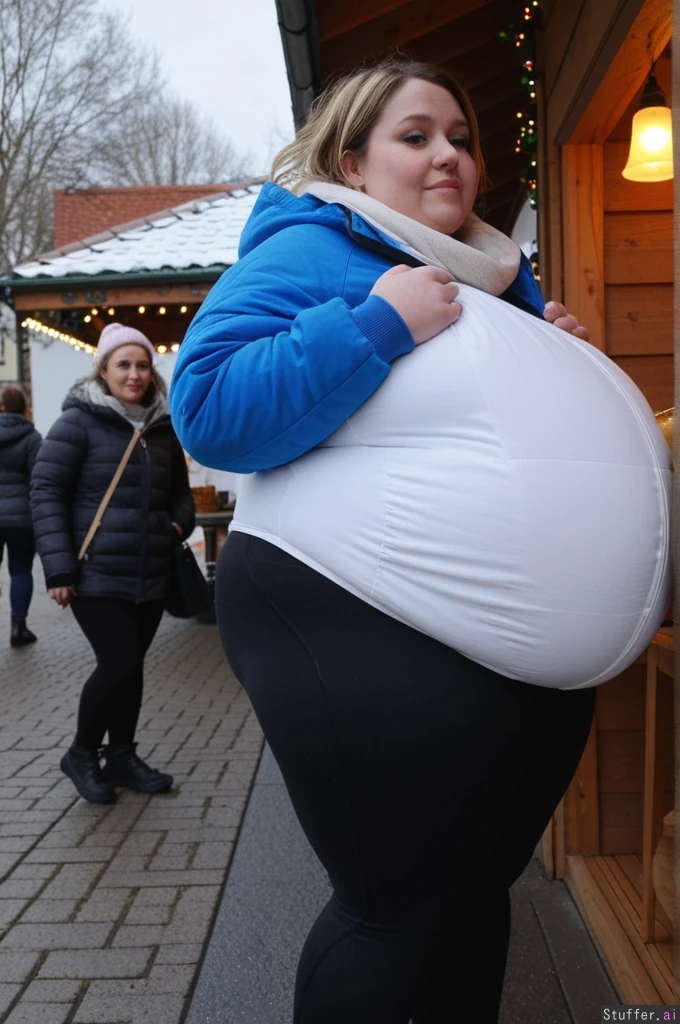 Cinematic film still, Netflix European drama aesthetic, close-up photo taken by friend, observational angle, female college student, 21-years-old, Caucasian, obese blob with a hyper_belly, (wearing ultra covering trendy outfit:1.3), beautiful narrow symmetrical face of a top model, ultra attractive face, (oversized covering long huge fat wobbly bloated white long college sweatshirt layered under open oversized padded blue winter jacket:1.3), extra-long cut reaching mid-thigh, straight weighted hem, non-elastic fabric, shirt and jacket fully covering belly, cannot ride up, (covering fat bloated cushiony high-waisted opaque black thermal leggings:1.3), waistband positioned high above navel, waistband locked in place by extreme belly pressure, leggings stretched far forward by massive lower belly volume, clear double-belly geometry, (fully clothed:1.3), morbidly obese with an ultra huge saggy hanging belly, fully contained beneath clothing, very heavy lower belly projecting forward and downward, tight waistband compressing belly fat deeply, fabric pulled taut above, heavy winter folds below, standing next to wooden market tables stacked with sausages, waffles and mugs, side view, totally stuffed posture, slow grounded stance, Prom makeup, rosy cheeks, foxy smile with eyeliner, glossy lips, Dark blonde hair tucked into scarf with loose strands, small hoops, small bust,big eyes, realistic body volume physics, ultra realistic belly hang and winter fabric tension, background: German Christmas market, lights, steam, people staring with mixed awe and curiosity Overcast winter afternoon, cold diffused light, Netflix color science, cool blues, warm highlights, film grain, lens breathing, candid realism