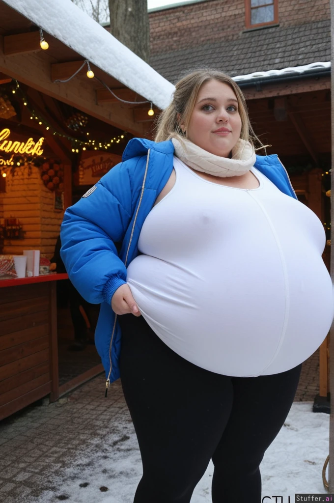Cinematic film still, Netflix European drama aesthetic, close-up photo taken by friend, observational angle, female college student, 21-years-old, Caucasian, obese blob with a hyper_belly, (wearing ultra covering trendy outfit:1.3), beautiful narrow symmetrical face of a top model, ultra attractive face, (oversized covering long huge fat wobbly bloated white long college sweatshirt layered under open oversized padded blue winter jacket:1.3), extra-long cut reaching mid-thigh, straight weighted hem, non-elastic fabric, shirt and jacket fully covering belly, cannot ride up, (covering fat bloated cushiony high-waisted opaque black thermal leggings:1.3), waistband positioned high above navel, waistband locked in place by extreme belly pressure, leggings stretched far forward by massive lower belly volume, clear double-belly geometry, (fully clothed:1.3), morbidly obese with an ultra huge saggy hanging belly, fully contained beneath clothing, very heavy lower belly projecting forward and downward, tight waistband compressing belly fat deeply, fabric pulled taut above, heavy winter folds below, standing next to wooden market tables stacked with sausages, waffles and mugs, side view, totally stuffed posture, slow grounded stance, Prom makeup, rosy cheeks, foxy smile with eyeliner, glossy lips, Dark blonde hair tucked into scarf with loose strands, small hoops, small bust,big eyes, realistic body volume physics, ultra realistic belly hang and winter fabric tension, background: German Christmas market, lights, steam, people staring with mixed awe and curiosity Overcast winter afternoon, cold diffused light, Netflix color science, cool blues, warm highlights, film grain, lens breathing, candid realism