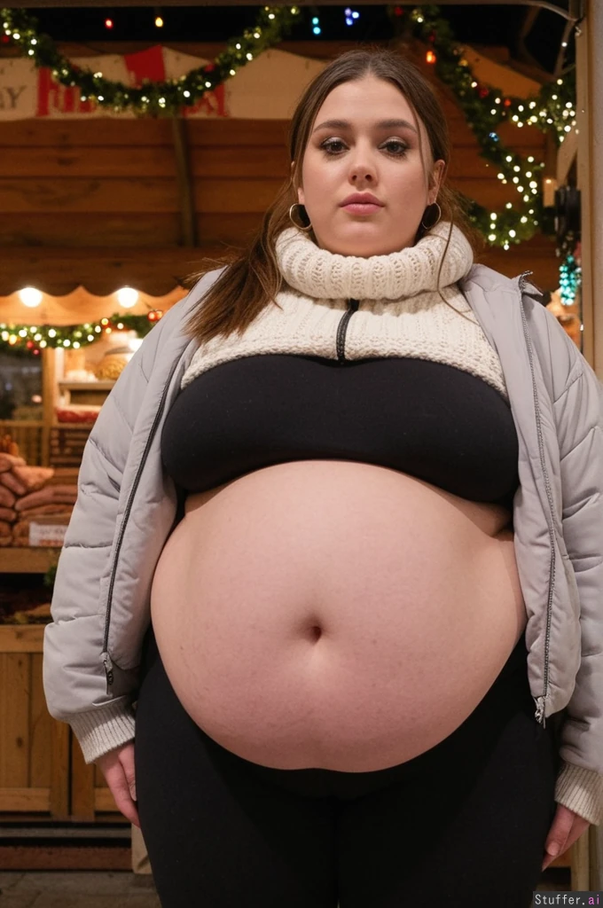 Cinematic film still, Netflix aesthetic, close-up photo taken by friend, observational angle, female college student, 21-years-old, Caucasian, obese blob with a hyper_belly, beautiful narrow symmetrical face of a top model, ultra attractive face, (wearing ultra covering trendy outfit:1.3), (oversized covering long huge fat wobbly bloated long Christmas sweater layered under open oversized long padded winter jacket:1.3), extra-long cut reaching mid-thigh, straight weighted hem, non-elastic fabric, shirt and jacket fully covering belly, cannot ride up, (covering fat bloated cushiony high-waisted opaque black thermal leggings:1.3), waistband positioned high above navel, waistband locked in place by extreme belly pressure, leggings stretched far forward by massive lower belly volume, clear double-belly geometry, (fully clothed:1.3), morbidly obese with an ultra huge saggy hanging belly, fully contained beneath clothing, very heavy lower belly projecting forward and downward, tight waistband compressing belly fat deeply, fabric pulled taut above, heavy winter folds below, standing next to wooden market tables stacked with sausages, waffles and mugs, side view, totally stuffed posture, slow grounded stance, soft winter makeup, rosy cheeks, eyeliner, glossy lips, big hoops earrings, brunette messy ponytail tucked into scarf with loose strands, small hoops, small bust,big eyes, realistic body volume physics, ultra realistic belly hang and winter fabric tension, background: German Christmas market, lights, steam, people staring with mixed awe and curiosity Overcast winter afternoon, cold diffused light, Netflix color science, cool blues, warm highlights, film grain, lens breathing, candid realism