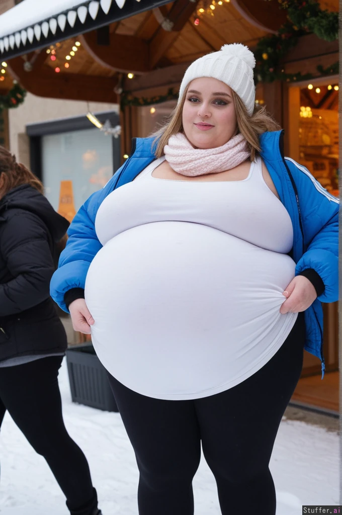 Cinematic film still, Netflix European drama aesthetic, close-up photo taken by friend, observational angle, female college student, 21-years-old, Caucasian, obese blob with a hyper_belly, (wearing ultra covering trendy outfit:1.3), beautiful narrow symmetrical face of a top model, ultra attractive face, (oversized covering long huge fat wobbly bloated white long college sweatshirt layered under open oversized padded blue winter jacket:1.3), extra-long cut reaching mid-thigh, straight weighted hem, non-elastic fabric, shirt and jacket fully covering belly, cannot ride up, (covering fat bloated cushiony high-waisted opaque black thermal leggings:1.3), waistband positioned high above navel, waistband locked in place by extreme belly pressure, leggings stretched far forward by massive lower belly volume, clear double-belly geometry, (fully clothed:1.3), morbidly obese with an ultra huge saggy hanging belly, fully contained beneath clothing, very heavy lower belly projecting forward and downward, tight waistband compressing belly fat deeply, fabric pulled taut above, heavy winter folds below, standing next to wooden market tables stacked with sausages, waffles and mugs, side view, totally stuffed posture, slow grounded stance, Prom makeup, rosy cheeks, foxy smile with eyeliner, glossy lips, Dark blonde hair tucked into scarf with loose strands, small hoops, small bust,big eyes, realistic body volume physics, ultra realistic belly hang and winter fabric tension, background: German Christmas market, lights, steam, people staring with mixed awe and curiosity Overcast winter afternoon, cold diffused light, Netflix color science, cool blues, warm highlights, film grain, lens breathing, candid realism