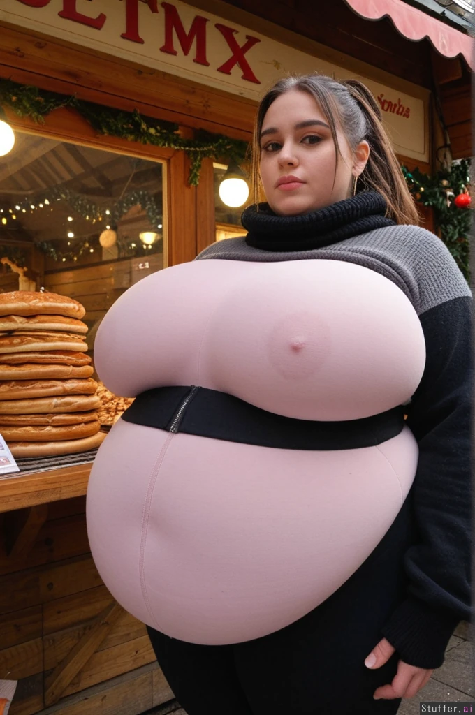 Cinematic film still, Netflix aesthetic, close-up photo taken by friend, observational angle, female college student, 21-years-old, Caucasian, obese blob with a hyper_belly, beautiful narrow symmetrical face of a top model, ultra attractive face, (wearing ultra covering trendy outfit:1.3), (oversized covering long huge fat wobbly bloated long winter sweater layered under open oversized long padded winter jacket:1.3), extra-long cut reaching mid-thigh, straight weighted hem, non-elastic fabric, shirt and jacket fully covering belly, cannot ride up, (covering fat bloated cushiony high-waisted opaque black thermal leggings:1.3), waistband positioned high above navel, waistband locked in place by extreme belly pressure, leggings stretched far forward by massive lower belly volume, clear double-belly geometry, (fully clothed:1.3), morbidly obese with an ultra huge saggy hanging belly, fully contained beneath clothing, very heavy lower belly projecting forward and downward, tight waistband compressing belly fat deeply, fabric pulled taut above, heavy winter folds below, standing next to wooden market tables stacked with sausages, waffles and mugs, side view, totally stuffed posture, slow grounded stance, soft winter makeup, rosy cheeks, eyeliner, glossy lips, big hoops earrings, brunette messy ponytail tucked into scarf with loose strands, small hoops, small bust,big eyes, realistic body volume physics, ultra realistic belly hang and winter fabric tension, background: German Christmas market, lights, steam, people staring with mixed awe and curiosity Overcast winter afternoon, cold diffused light, Netflix color science, cool blues, warm highlights, film grain, lens breathing, candid realism