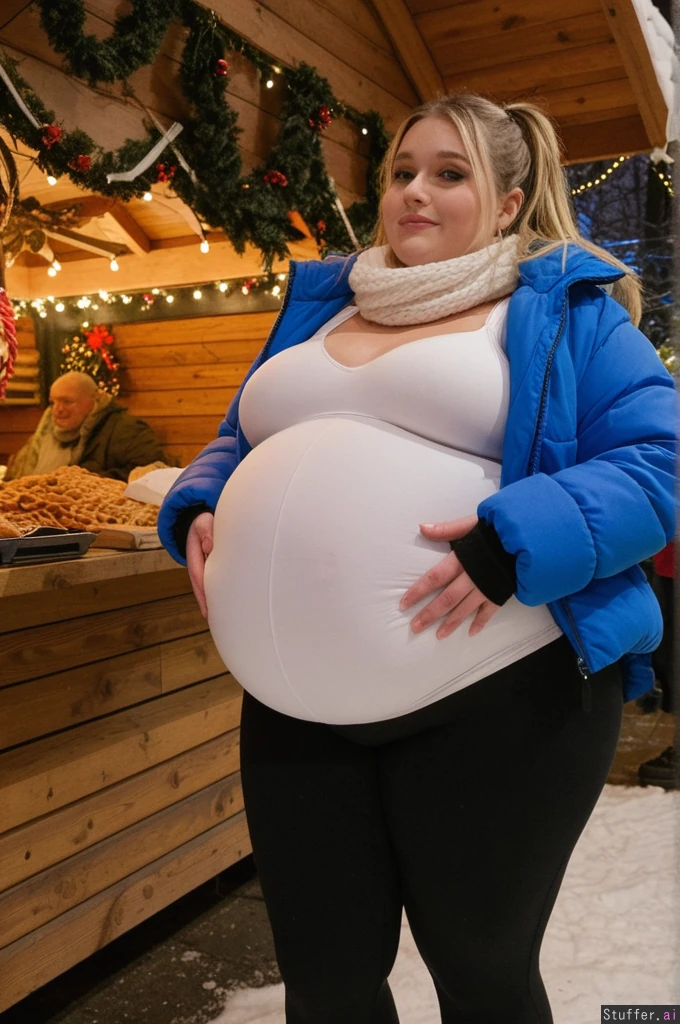 Cinematic film still, Netflix European drama aesthetic, close-up photo taken by friend, observational angle, female college student, 21-years-old, Caucasian, obese blob with a hyper_belly, (wearing ultra covering trendy outfit:1.3), beautiful narrow symmetrical face of a top model, ultra attractive face, (oversized covering long huge fat wobbly bloated white long winter sweater layered under open oversized padded blue winter jacket:1.3), extra-long cut reaching mid-thigh, straight weighted hem, non-elastic fabric, shirt and jacket fully covering belly, cannot ride up, (covering fat bloated cushiony high-waisted opaque black thermal leggings:1.3), waistband positioned high above navel, waistband locked in place by extreme belly pressure, leggings stretched far forward by massive lower belly volume, clear double-belly geometry, (fully clothed:1.3), morbidly obese with an ultra huge saggy hanging belly, fully contained beneath clothing, very heavy lower belly projecting forward and downward, tight waistband compressing belly fat deeply, fabric pulled taut above, heavy winter folds below, standing next to wooden market tables stacked with sausages, waffles and mugs, side view, totally stuffed posture, slow grounded stance, Prom makeup, rosy cheeks, foxy smile with eyeliner, glossy lips, Dark blonde hair tucked into scarf with loose strands, small hoops, small bust,big eyes, realistic body volume physics, ultra realistic belly hang and winter fabric tension, background: German Christmas market, lights, steam, people staring with mixed awe and curiosity Overcast winter afternoon, cold diffused light, Netflix color science, cool blues, warm highlights, film grain, lens breathing, candid realism