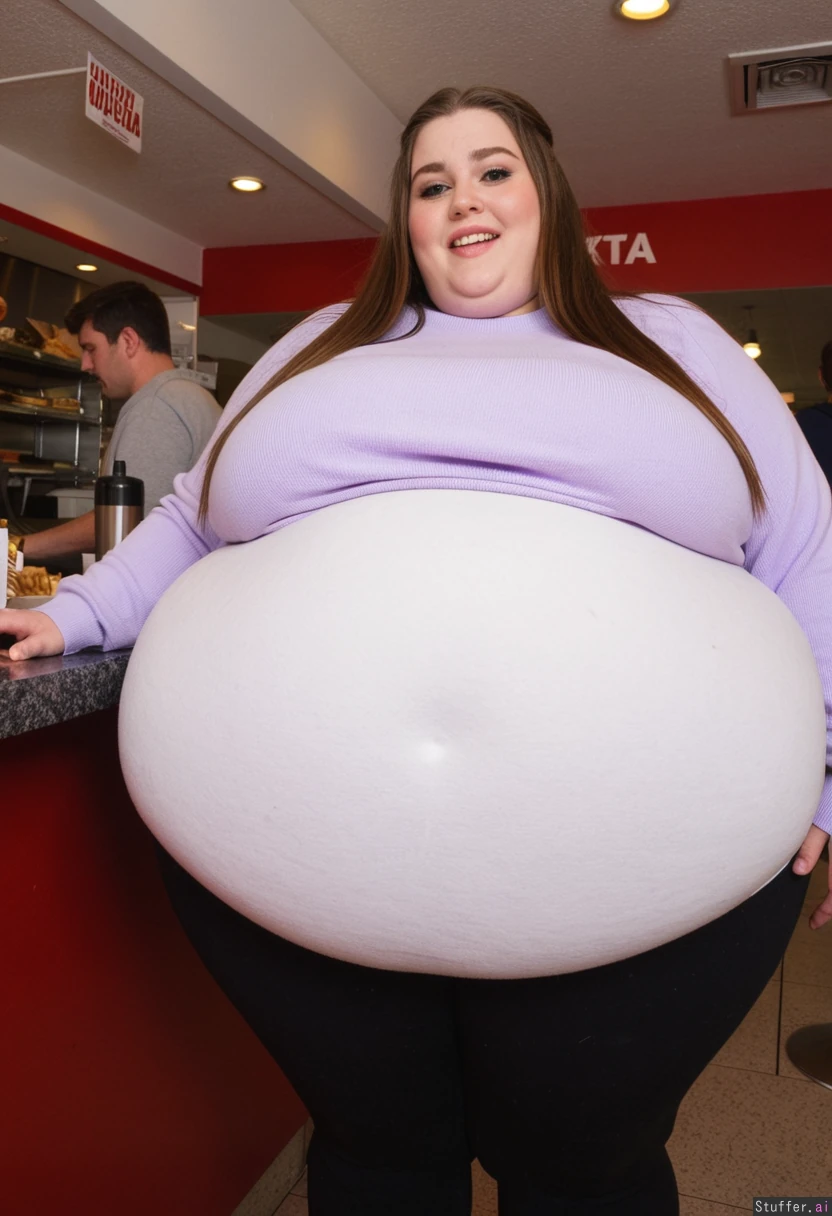Close-up amateur photo taken by friend, female college student, 21-years-old, Caucasian, morbidly obese, largest belly ever seen beneath clothing (wearing ultra covering casual outfit:1.3), (oversized huge fat snug bloated overstuffed wihite and lilac sweater dress, extra-long cut, opaque fabric:1.3), hoodie fully covering belly, cannot ride up, (covering fat bloated cushiony adipose ultra high-waisted black leggings:1.3), waistband high above navel, locked by belly pressure, (fully clothed:1.3), morbidly obese with ultra huge saggy hanging belly, belly projecting strongly forward, lower belly hanging toward thighs, waistband compressing hyper_belly into clear double-belly geometry, fabric stretched tight at front, deep folds below, standing inside a crowded fast-food restaurant with friends, talking and laughing, trays overflowing with food, side view, stuffed stance, beautiful symmetrical face, bold eyeliner, glossy lips, simple jewelry, small bust, long straight hair, realistic body volume physics, ultra realistic belly hang and fabric tension, background: fast-food counters, fries, burgers, drinks everywhere, bright indoor lighting, busy social scene, ultra-detailed, ultra-realistic, candid urban realism, slight motion blur natural asymmetry Small skin imperfections realistic fabric wrinkles uneven lighting lens breathing chromatic aberration film grain sensor noise neutral color grading cinematic color science accurate white balance true skin tones natural color palette RAW DSLR photo documentary photography 35mm lens f/2.0 aperture natural skin texture micro contrast diffused natural light realistic fabric tension candid shot true color rendition