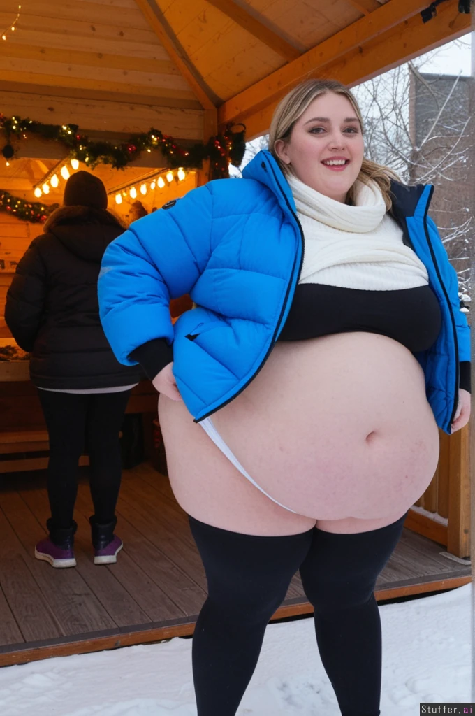 Cinematic film still, Netflix European drama aesthetic, close-up photo taken by friend, observational angle, female college student, 21-years-old, Caucasian, obese blob with a hyper_belly, (wearing ultra covering trendy outfit:1.3), beautiful narrow symmetrical face of a top model, ultra attractive face, (oversized covering long huge fat wobbly bloated white long winter sweater layered under open oversized padded blue winter jacket:1.3), extra-long cut reaching mid-thigh, straight weighted hem, non-elastic fabric, shirt and jacket fully covering belly, cannot ride up, (covering fat bloated cushiony high-waisted opaque black thermal leggings:1.3), waistband positioned high above navel, waistband locked in place by extreme belly pressure, leggings stretched far forward by massive lower belly volume, clear double-belly geometry, (fully clothed:1.3), morbidly obese with an ultra huge saggy hanging belly, fully contained beneath clothing, very heavy lower belly projecting forward and downward, tight waistband compressing belly fat deeply, fabric pulled taut above, heavy winter folds below, standing next to wooden market tables stacked with sausages, waffles and mugs, side view, totally stuffed posture, slow grounded stance, Prom makeup, rosy cheeks, foxy smile with eyeliner, glossy lips, Dark blonde hair tucked into scarf with loose strands, small hoops, small bust,big eyes, realistic body volume physics, ultra realistic belly hang and winter fabric tension, background: German Christmas market, lights, steam, people staring with mixed awe and curiosity Overcast winter afternoon, cold diffused light, Netflix color science, cool blues, warm highlights, film grain, lens breathing, candid realism