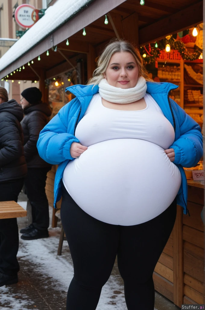 Cinematic film still, Netflix European drama aesthetic, close-up photo taken by friend, observational angle, female college student, 21-years-old, Caucasian, obese blob with a hyper_belly, (wearing ultra covering trendy outfit:1.3), beautiful narrow symmetrical face of a top model, ultra attractive face, (oversized covering long huge fat wobbly bloated white long winter sweater layered under open oversized padded blue winter jacket:1.3), extra-long cut reaching mid-thigh, straight weighted hem, non-elastic fabric, shirt and jacket fully covering belly, cannot ride up, (covering fat bloated cushiony high-waisted opaque black thermal leggings:1.3), waistband positioned high above navel, waistband locked in place by extreme belly pressure, leggings stretched far forward by massive lower belly volume, clear double-belly geometry, (fully clothed:1.3), morbidly obese with an ultra huge saggy hanging belly, fully contained beneath clothing, very heavy lower belly projecting forward and downward, tight waistband compressing belly fat deeply, fabric pulled taut above, heavy winter folds below, standing next to wooden market tables stacked with sausages, waffles and mugs, side view, totally stuffed posture, slow grounded stance, Prom makeup, rosy cheeks, foxy smile with eyeliner, glossy lips, Dark blonde hair tucked into scarf with loose strands, small hoops, small bust,big eyes, realistic body volume physics, ultra realistic belly hang and winter fabric tension, background: German Christmas market, lights, steam, people staring with mixed awe and curiosity Overcast winter afternoon, cold diffused light, Netflix color science, cool blues, warm highlights, film grain, lens breathing, candid realism