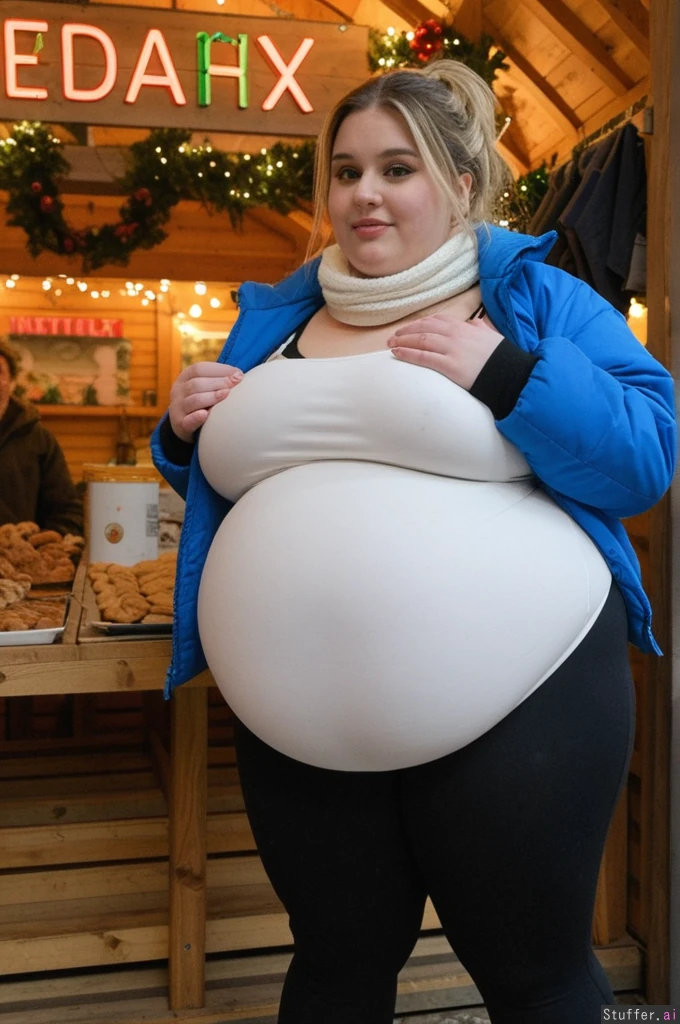 Cinematic film still, Netflix European drama aesthetic, close-up photo taken by friend, observational angle, female college student, 21-years-old, Caucasian, obese blob with a hyper_belly, (wearing ultra covering trendy outfit:1.3), beautiful narrow symmetrical face of a top model, ultra attractive face, (oversized covering long huge fat wobbly bloated white long winter sweater layered under open oversized padded blue winter jacket:1.3), extra-long cut reaching mid-thigh, straight weighted hem, non-elastic fabric, shirt and jacket fully covering belly, cannot ride up, (covering fat bloated cushiony high-waisted opaque black thermal leggings:1.3), waistband positioned high above navel, waistband locked in place by extreme belly pressure, leggings stretched far forward by massive lower belly volume, clear double-belly geometry, (fully clothed:1.3), morbidly obese with an ultra huge saggy hanging belly, fully contained beneath clothing, very heavy lower belly projecting forward and downward, tight waistband compressing belly fat deeply, fabric pulled taut above, heavy winter folds below, standing next to wooden market tables stacked with sausages, waffles and mugs, side view, totally stuffed posture, slow grounded stance, Prom makeup, rosy cheeks, foxy smile with eyeliner, glossy lips, Dark blonde hair tucked into scarf with loose strands, small hoops, small bust,big eyes, realistic body volume physics, ultra realistic belly hang and winter fabric tension, background: German Christmas market, lights, steam, people staring with mixed awe and curiosity Overcast winter afternoon, cold diffused light, Netflix color science, cool blues, warm highlights, film grain, lens breathing, candid realism