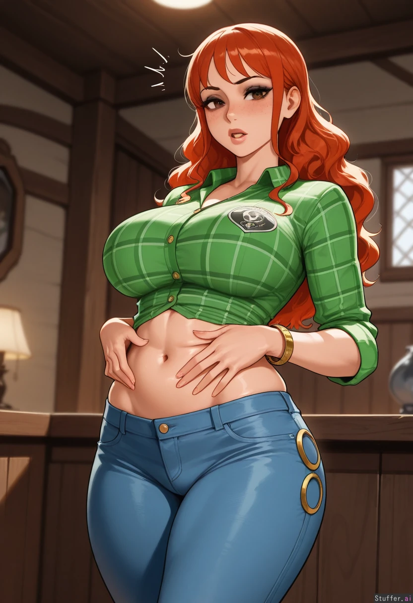nyantcha:1.2), (krekkov:1.4), (reiq:1.1), (kittew:1.3), best quality, intricate details, hdr, detailed eyes, (soft shading), realistic, dim lighting, realistic lighting, 1woman, (((Mami from One Piece))), ((alt mommy)), wavy_hair, standing, teasing (hand on abs), looking at viewer, flirty, red hair with red highlighted tips, brown eyes, black eyeshadow and eyeliner, lots of freckles, her bangs are red, wide hips, thick thighs, large breasts, (abs belly:1.0), tummy pooch, legs crossed, surprised, sweet, nave, flushed, (fit:1.0), slim figure, fatass, small protruding belly, Light green plaid collared shirt, low-rise blue jeans, gold bracelets, Pirate ship captains quarters, inside,