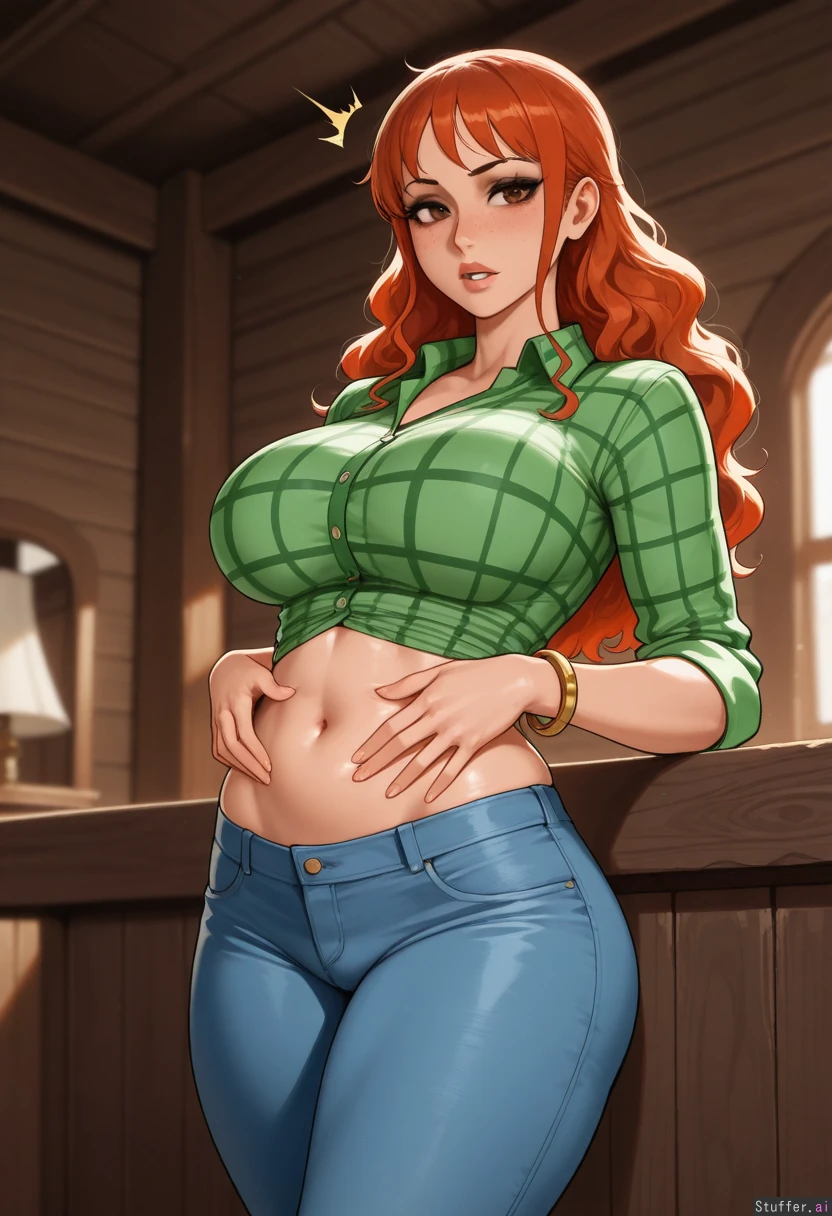nyantcha:1.2), (krekkov:1.4), (reiq:1.1), (kittew:1.3), best quality, intricate details, hdr, detailed eyes, (soft shading), realistic, dim lighting, realistic lighting, 1woman, (((Mami from One Piece))), ((alt mommy)), wavy_hair, standing, teasing (hand on abs), looking at viewer, flirty, red hair with red highlighted tips, brown eyes, black eyeshadow and eyeliner, lots of freckles, her bangs are red, wide hips, thick thighs, large breasts, (abs belly:0.2), tummy pooch, legs crossed, surprised, sweet, nave, flushed, (fit:1.0), slim figure, fatass, small protruding belly, Light green plaid collared shirt, low-rise blue jeans, gold bracelets, Pirate ship quarters, inside,