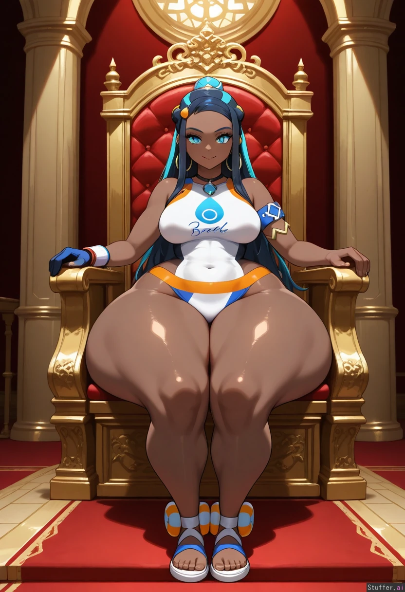 Nessa_pokemon, full body shot, throne room, sitting, smiling, ((bbw:1.5)), ((((really thick thighs:1.9)))), ((wide hips:1.9))