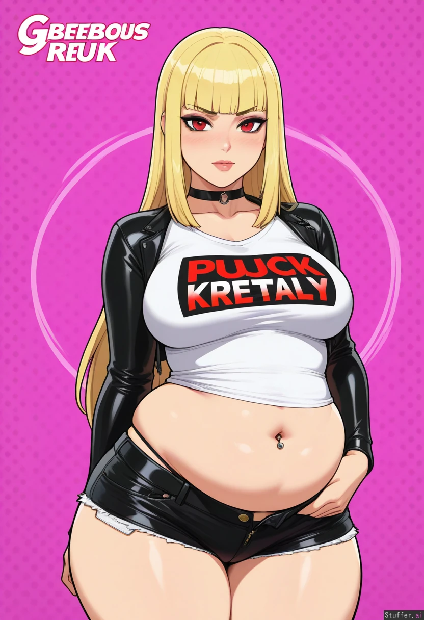 (Solo), stunning beauty, gorgeous, ((eyeliner)), long blonde hair, blunt bangs, scarlet eyes, (blushing), choker, medium breasts, ((thicker thighs)), ((adult)), thong showing, (navel piercing), ((punk)) krekkov(artist), reiq(artist), unzipped shorts (((chubby belly, bottom heavy, wide hips, chubby figure))), (((midriff peek)))