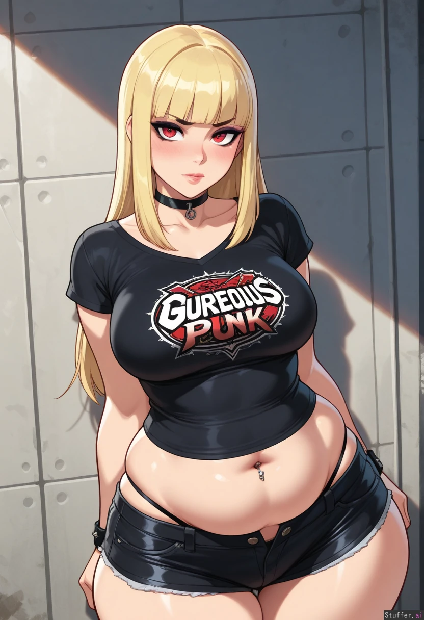 (Solo), stunning beauty, gorgeous, ((eyeliner)), long blonde hair, blunt bangs, scarlet eyes, (blushing), choker, medium breasts, ((thicker thighs)), ((adult)), thong showing, (navel piercing), ((punk)) krekkov(artist), reiq(artist), unzipped shorts (((chubby belly, bottom heavy, wide hips, chubby figure))), (((midriff peek)))
